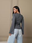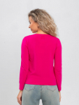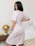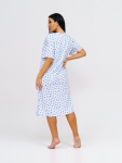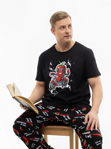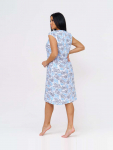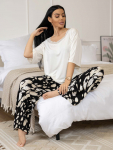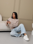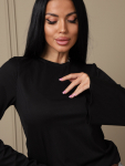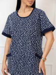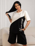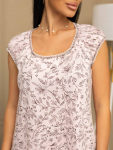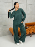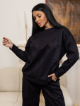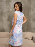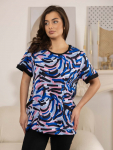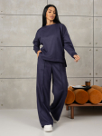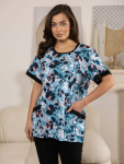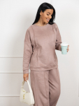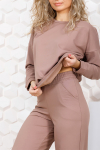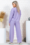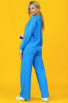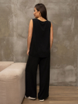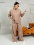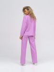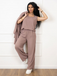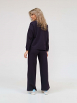 Костюм женский свободного силуэта, состоящий из футболки с коротким рукавом и брюк модели - шаровары. Верх с округлым вырезом горловины и целькроеным рукавом с манжетой. На спинке деокративная застежка на пуговицы. Брюки с широким поясом на резинке, для надежной фиксации на уровне талии и повышенного комфорта при носке, а так же удобными карманами с отрезным бочком. Элегантная летняя модель для повседневной носки.