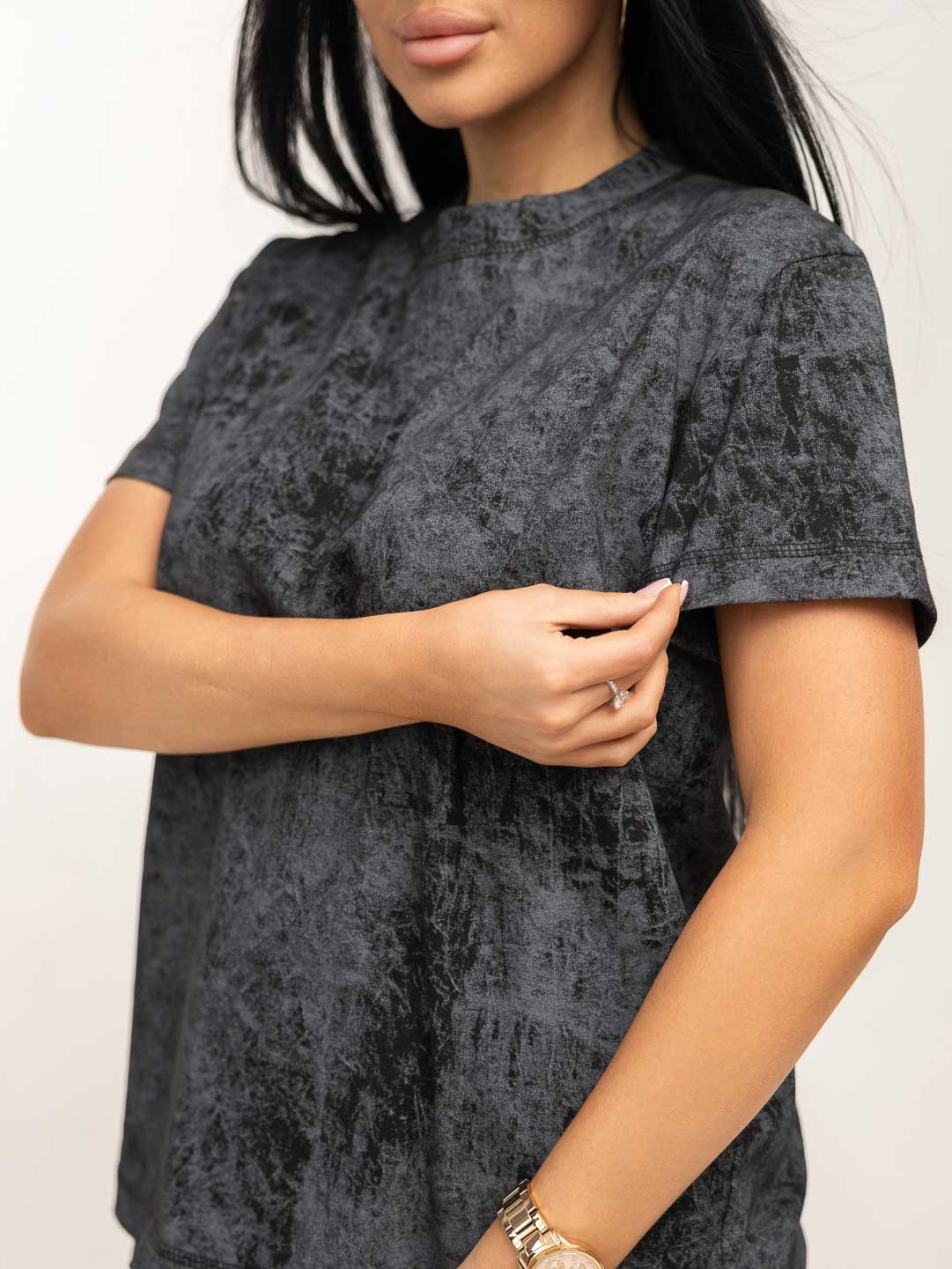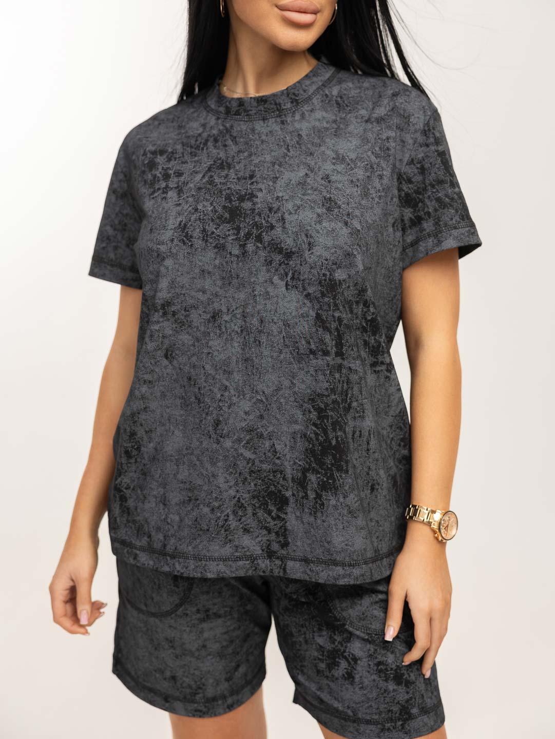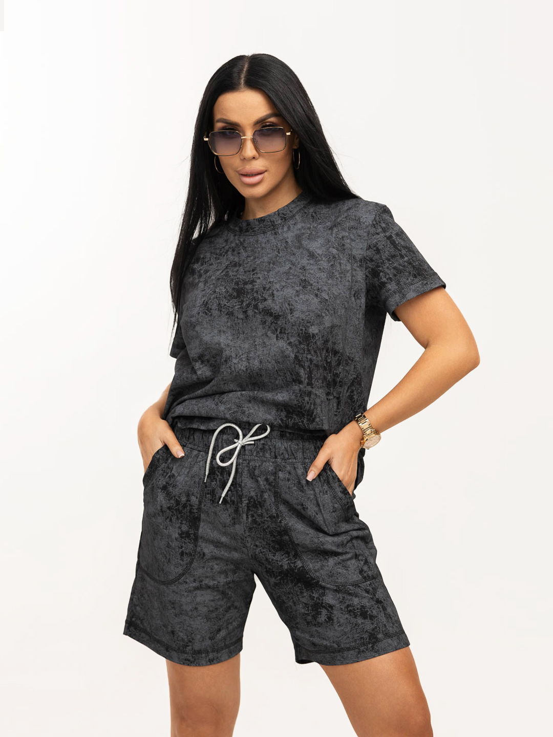 Костюм женский свободного силуэта, футболка и шорты. Футболка с коротким спущенным рукавом и округлой горловиной. Шорты с поясом на резинке, для удобной посадки и карманами с отрезным бочком. Яркий современный рисунок ткани в стиле - варенка. Легкий, удобный костюм из натурального хлопка, на каждый день.