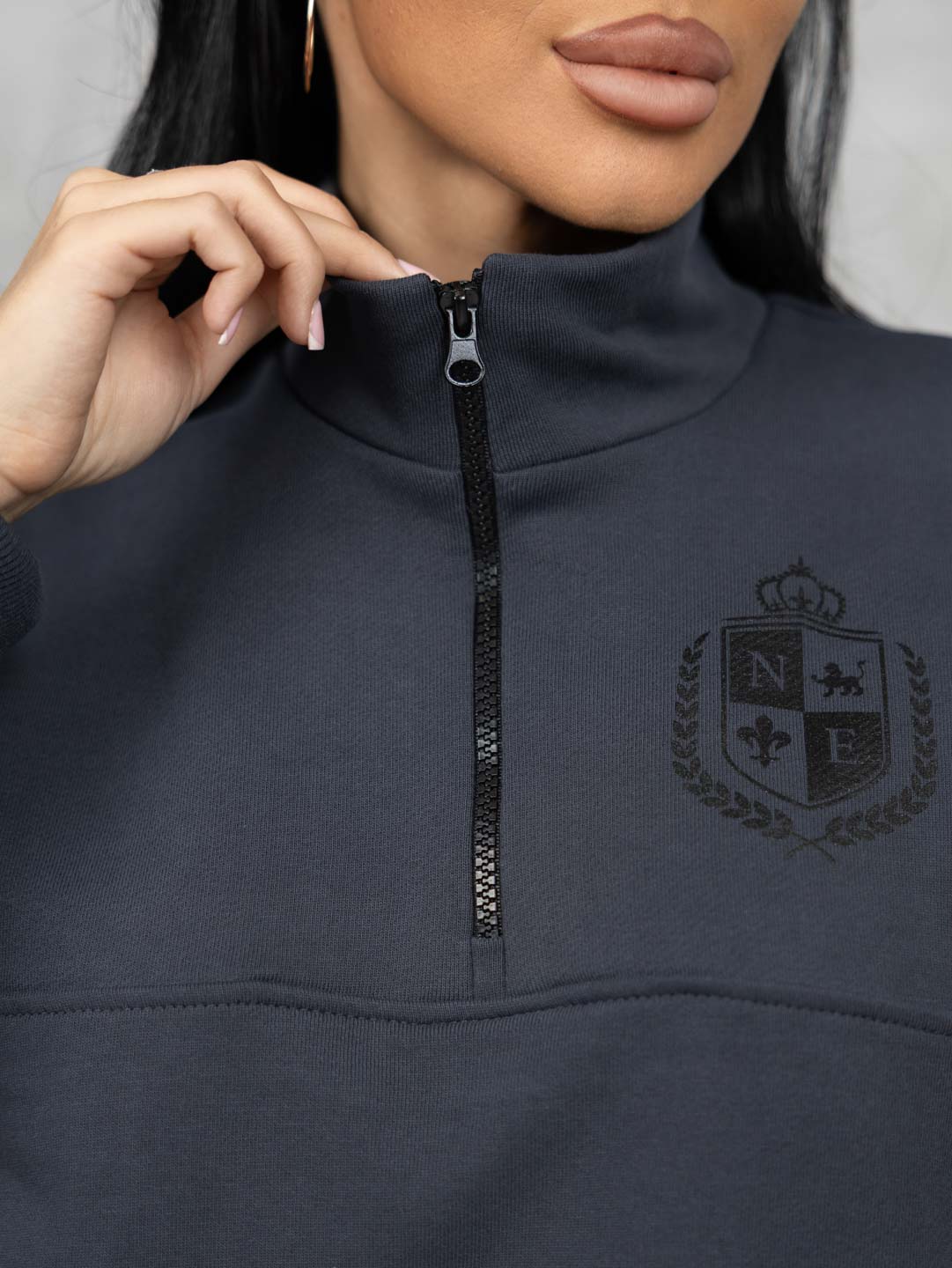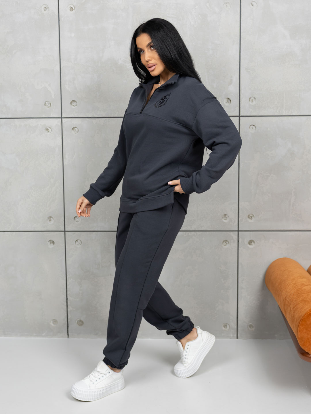 Костюм женский из футера диагонали. Толстовка с воротником стойкой на молнии, с разрезами по боковым швам и печатью эмблемой на кокетке спереди. Брюки Джогеры с имитацией стрелок спереди и декоративными швами сзади чуть ниже уровня колена, карманами в боковых швах и поясом-резикой с несколькими декоративными строчками.