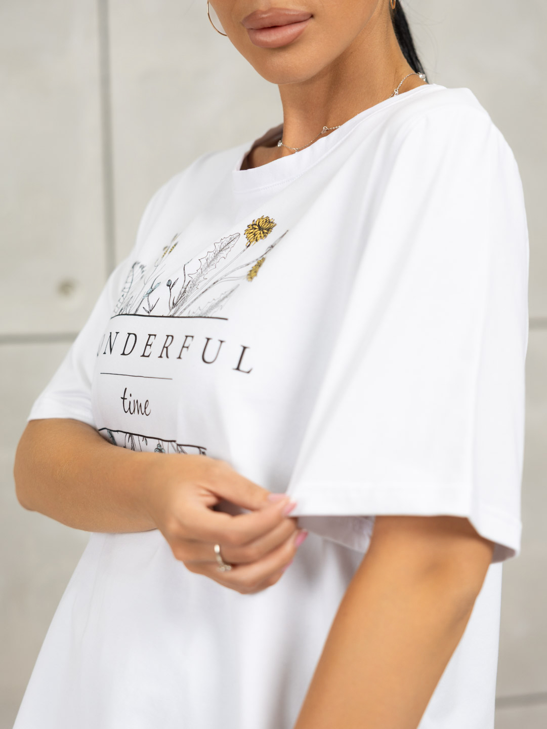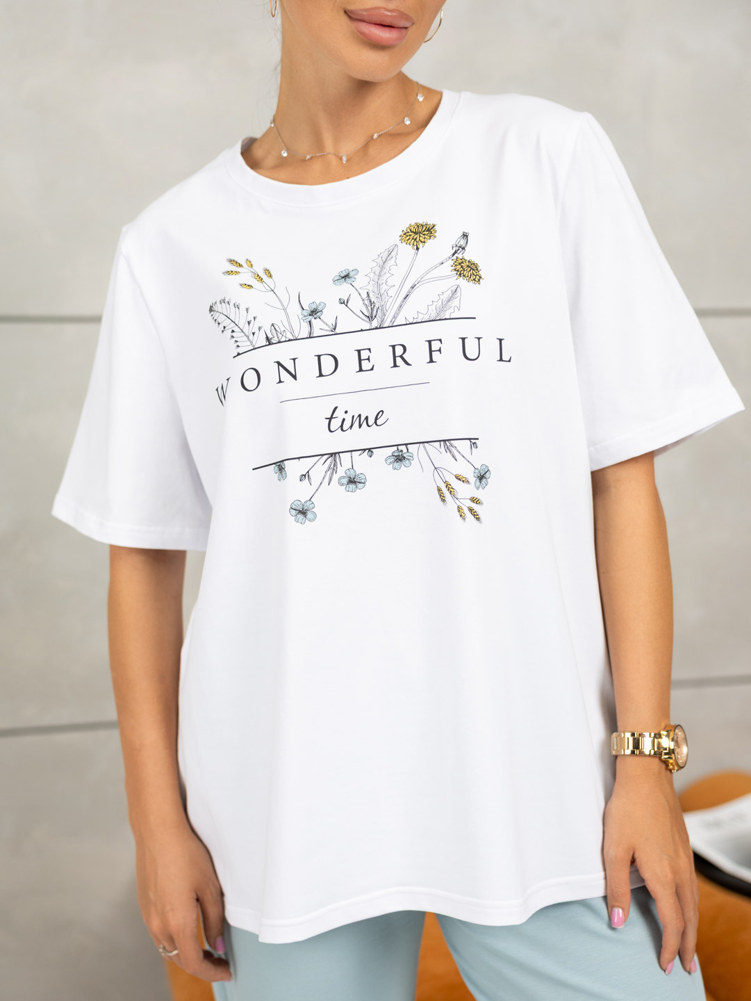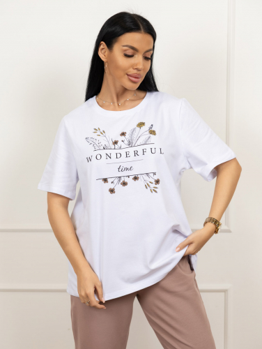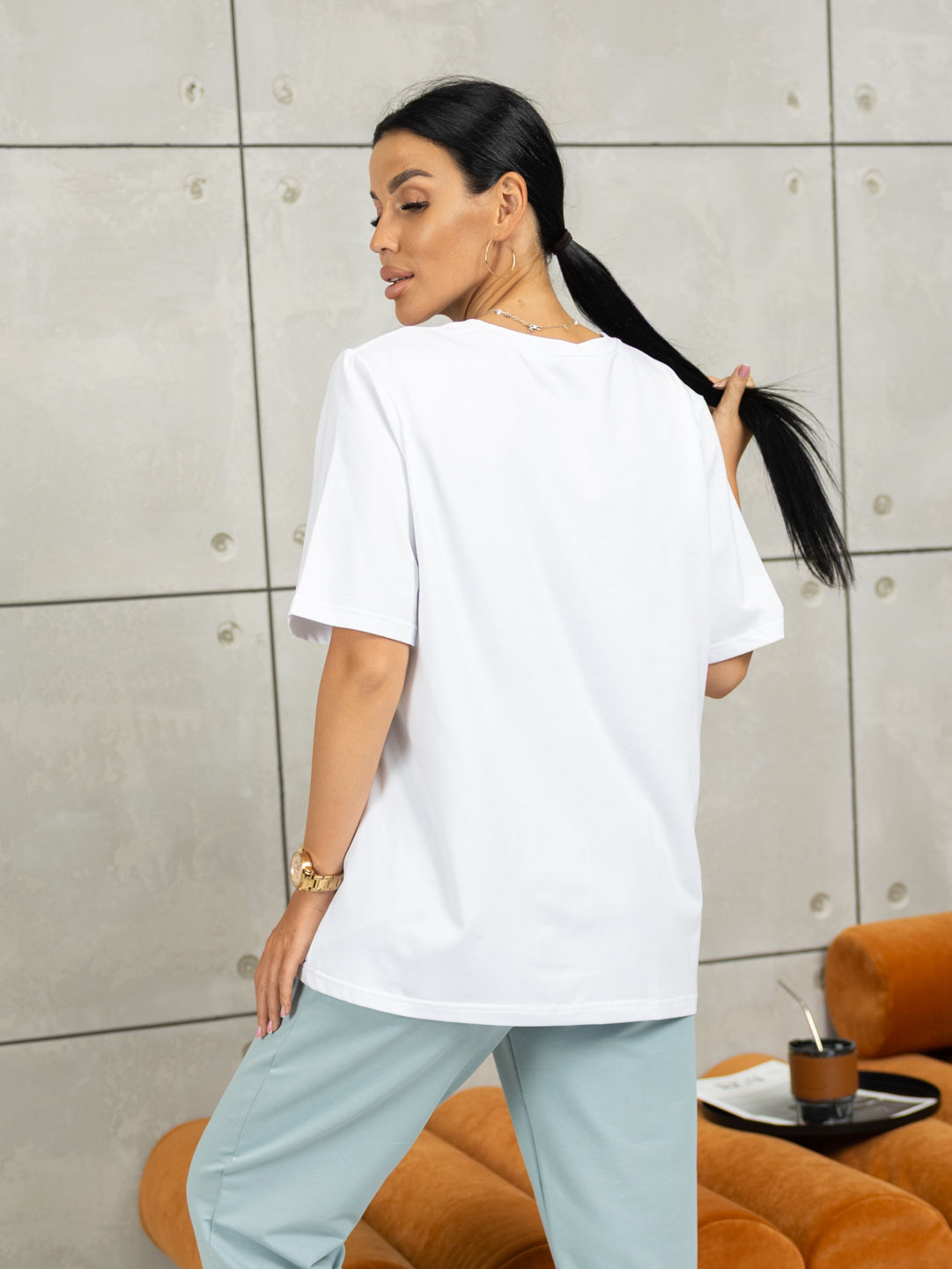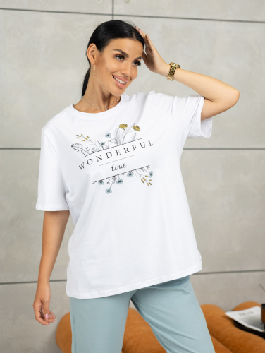 Костюм женский брюки и футболка. Футболка свободного силуэта с удлиненным втачным рукавом и округлой горловиной, на передней части печатный рисунок. Брюки с поясом на резинке, для надежной фиксации и карманами с отрезным бочком.