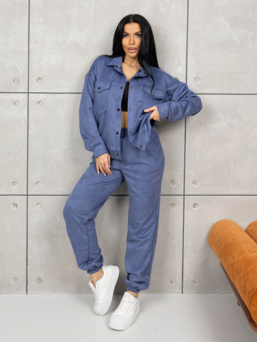 Костюм женский из мягкой, приятной замши. Тренд сезона. Куртка с длинным рукавом, на манжетах. Укомплектована удобными застежками на кнопках. Стильный отложный воротник и накладные карманы делают данную модель еще более эффектной и привлекающей взгляды. Удобные брюки на манжетах, с поясом на резинке и боковыми карманами.