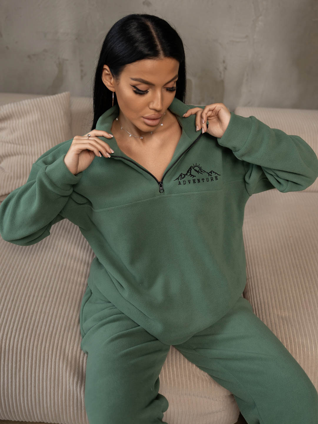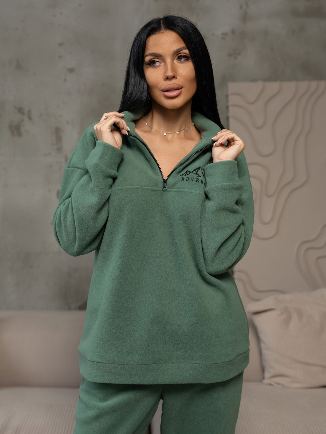 Костюм женский утепленный. Худи в стиле "оверсайз", с воротником - стойка на молнии, спущенным рукавом на манжетах и вышивкой на груди. Брюки - прямые, с удобным поясом на резинке, для лучшей посадки, и глубокими карманами с отрезным бочком. Низ брюк на резинке. Данный костюм - это уникальное сочетание стиля и комфорта в одной модели.