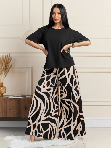 Элегентный домашний костюм из хлопка. Футболка с О-образной горловиной, спущенной линией плеча и коротким рукавом. Брюки-солнце с карманами и поясом на резинке.