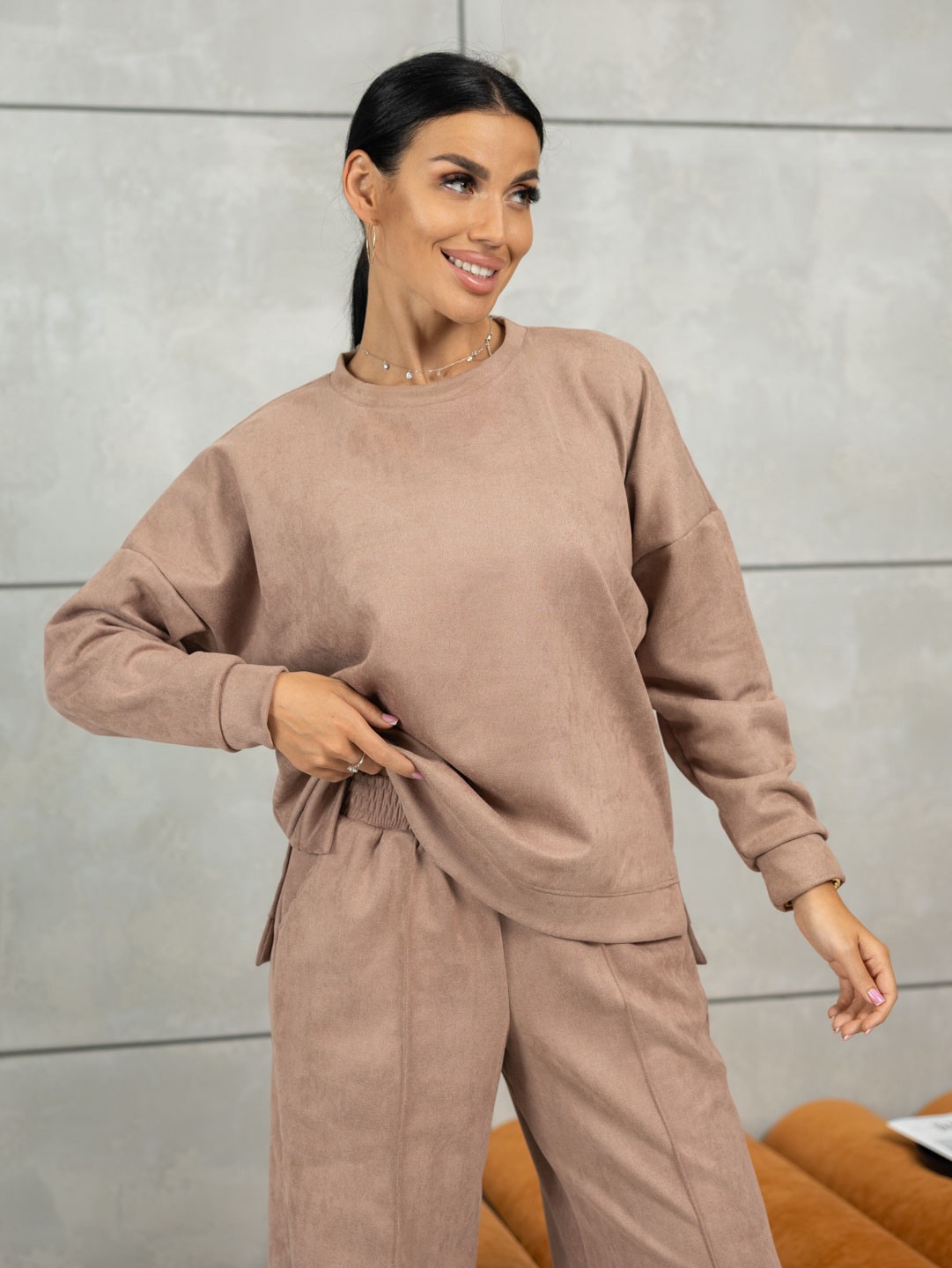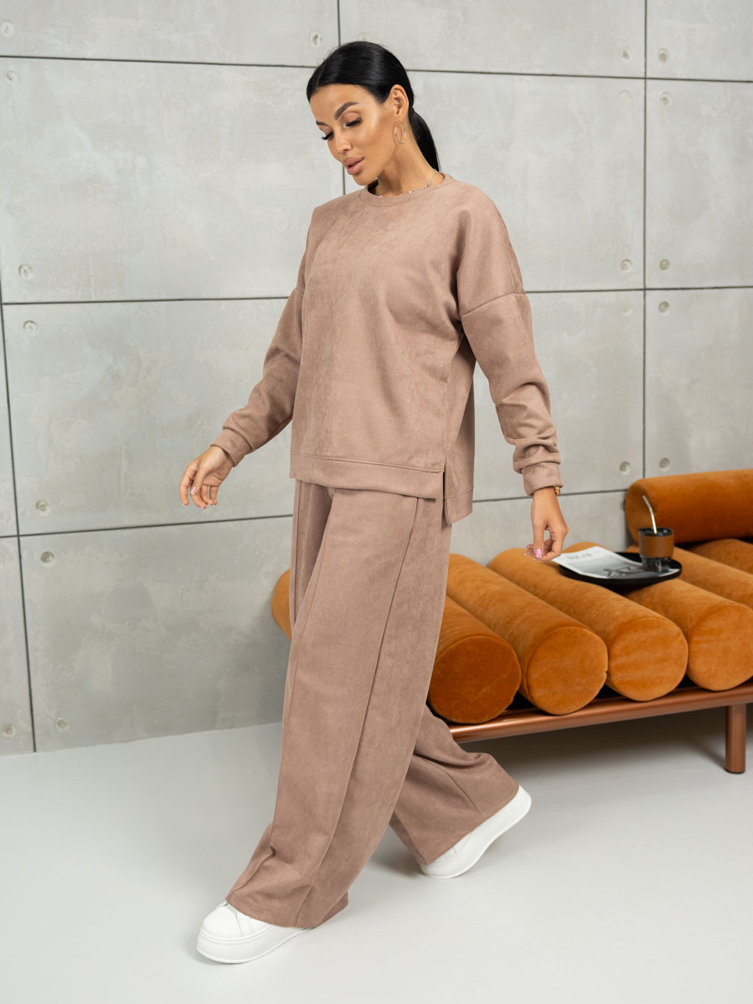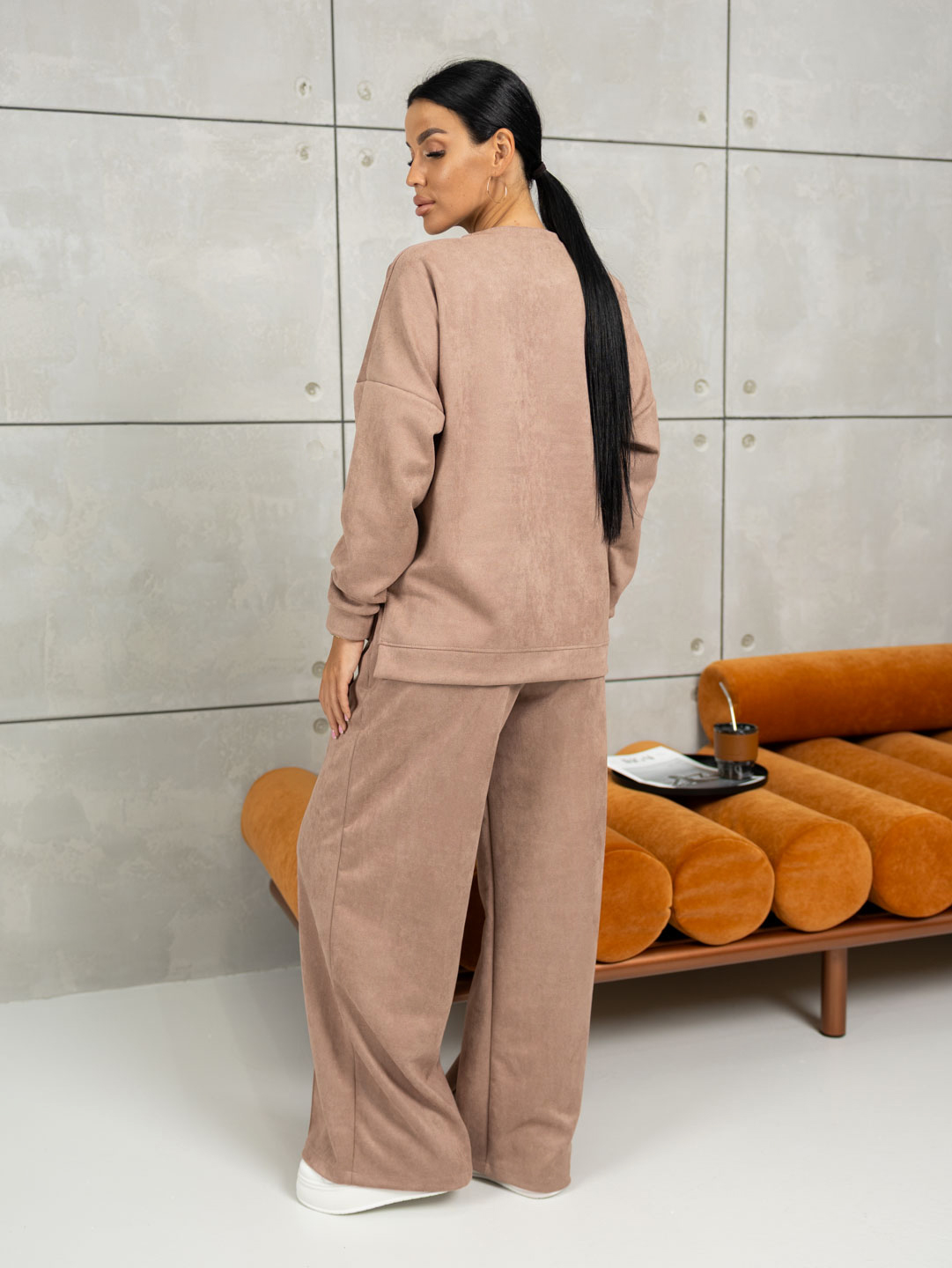 Почувствуйте себя королевой комфорта и стиля с нашим новым брючным костюмом! Двойка выполнена из мягкой и приятной на ощупь замши – прекрасный выбор на весну и осень. Оверсайз крой свитшота скрывает недостатки фигуры, разрезы по бокам и удлиненная спинка придают изюминку образу. А свободные штаны палаццо со стрелками – настоящая находка для современной девушки. Качественная одежда в стиле спорт-шик дарит уверенность себе и отличное настроение!