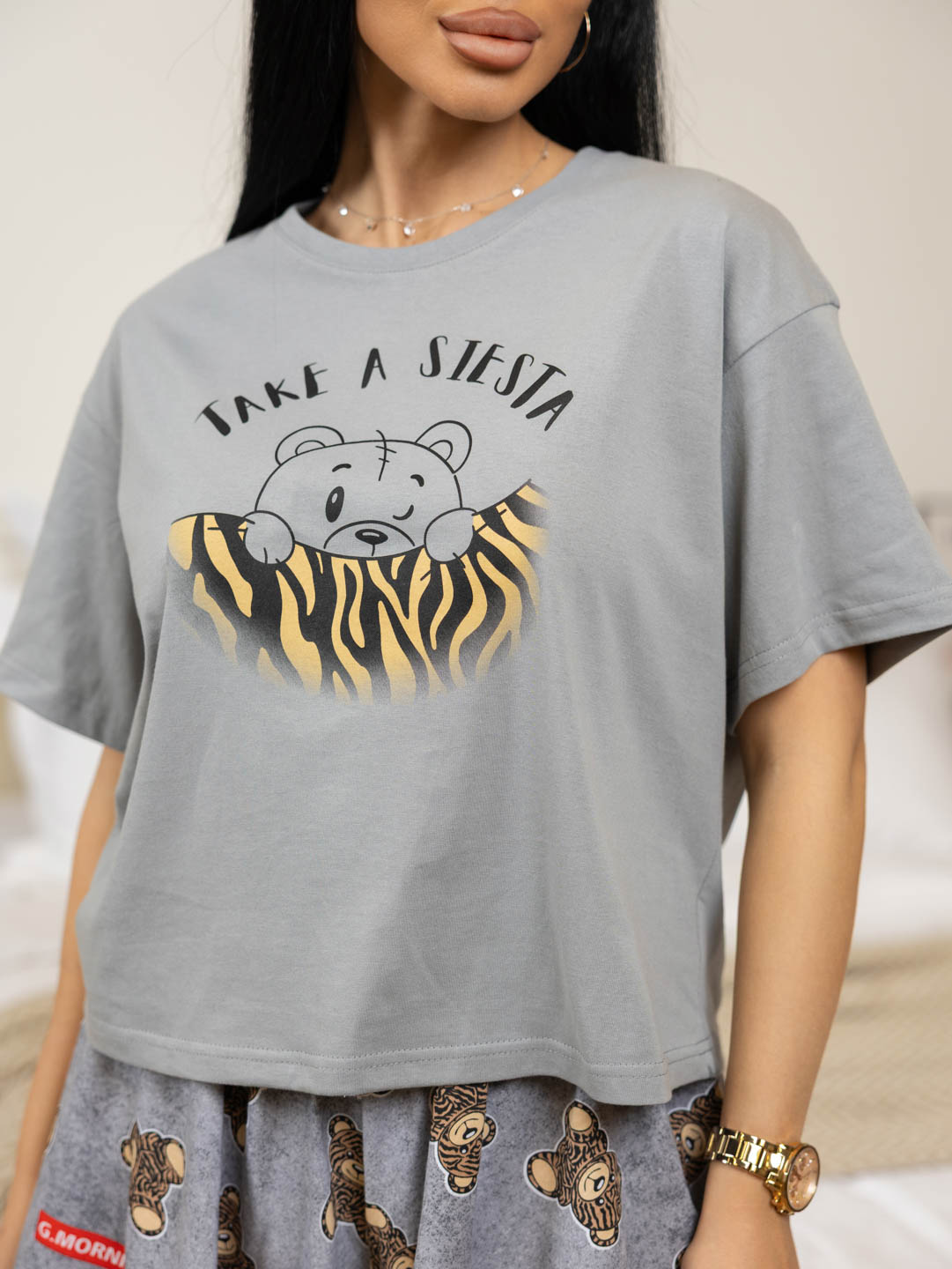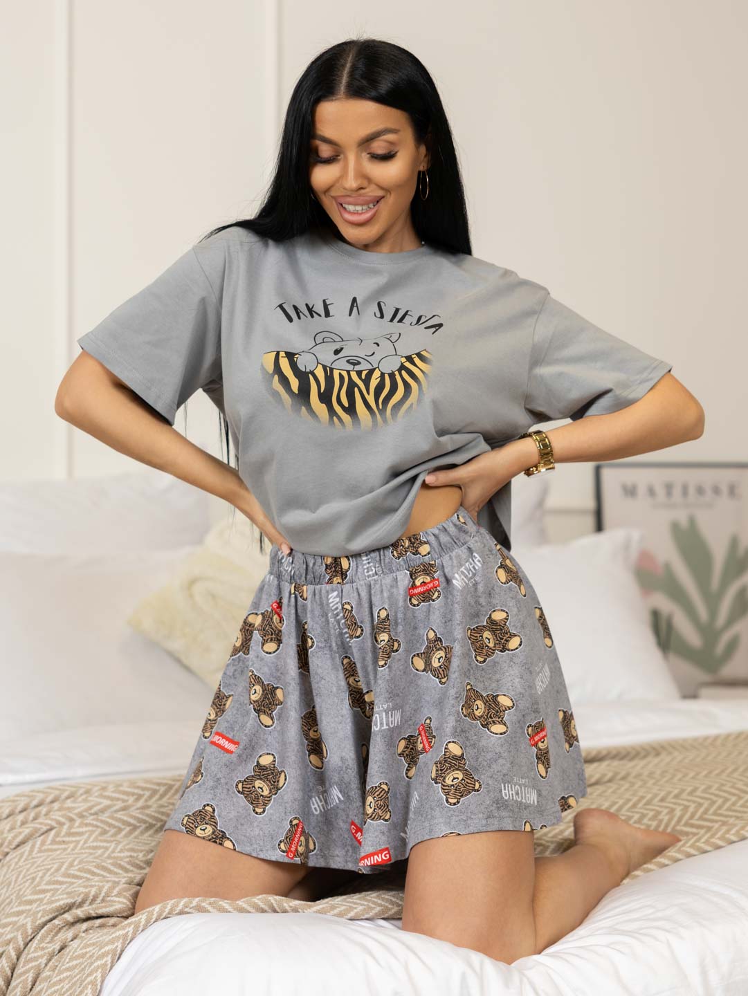 Очаровательная пижама-двойка, состоит из футболки оверсайз со спущенным плечом, печатью спереди и шорт-солнце, без карманов.
