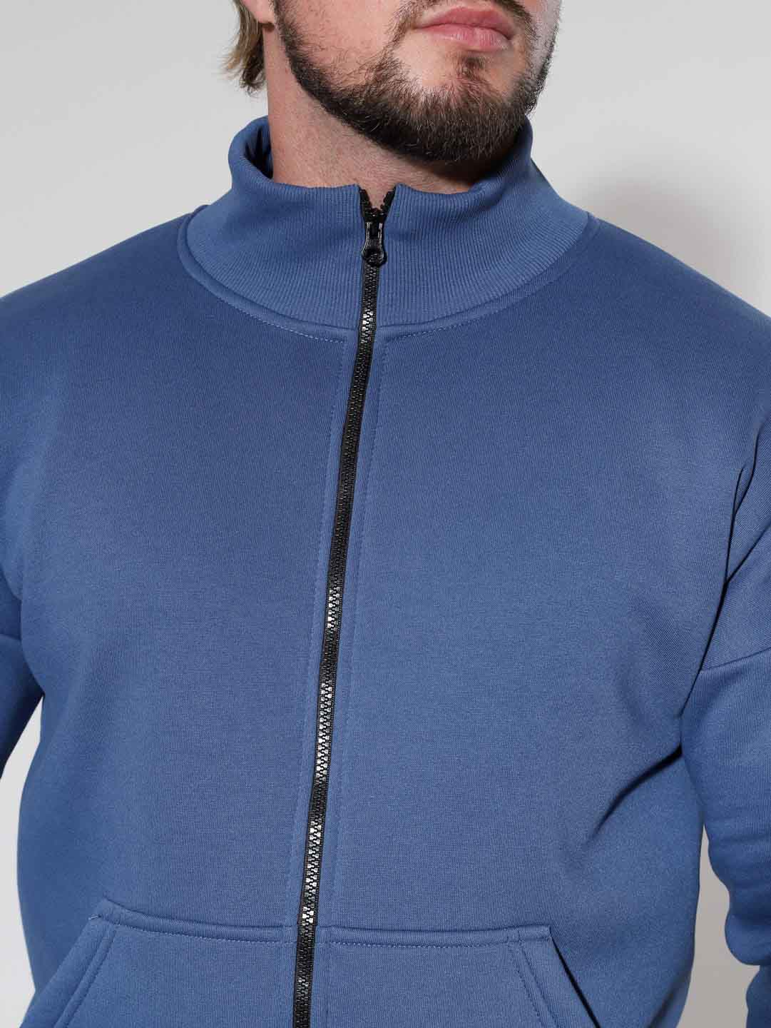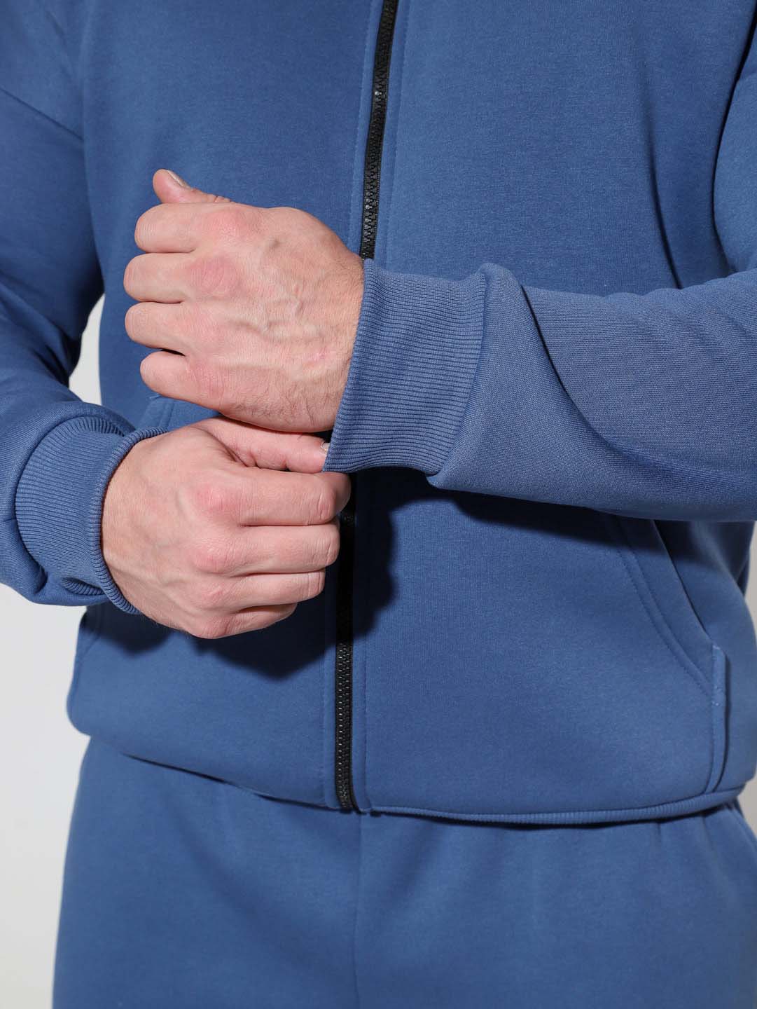Утепленный мужской костюм из футера с начесом, с крашением варенка. Толстовка с высоким горлом на молнии, карманом кенгуру и манжетами из кашкорсе по низу рукавов и кофты. Брюки джоггеры с карманами в боковых швах, поясом на резинке с несколькими отстрочками и манжетами из кашкорсе по низу брюк.