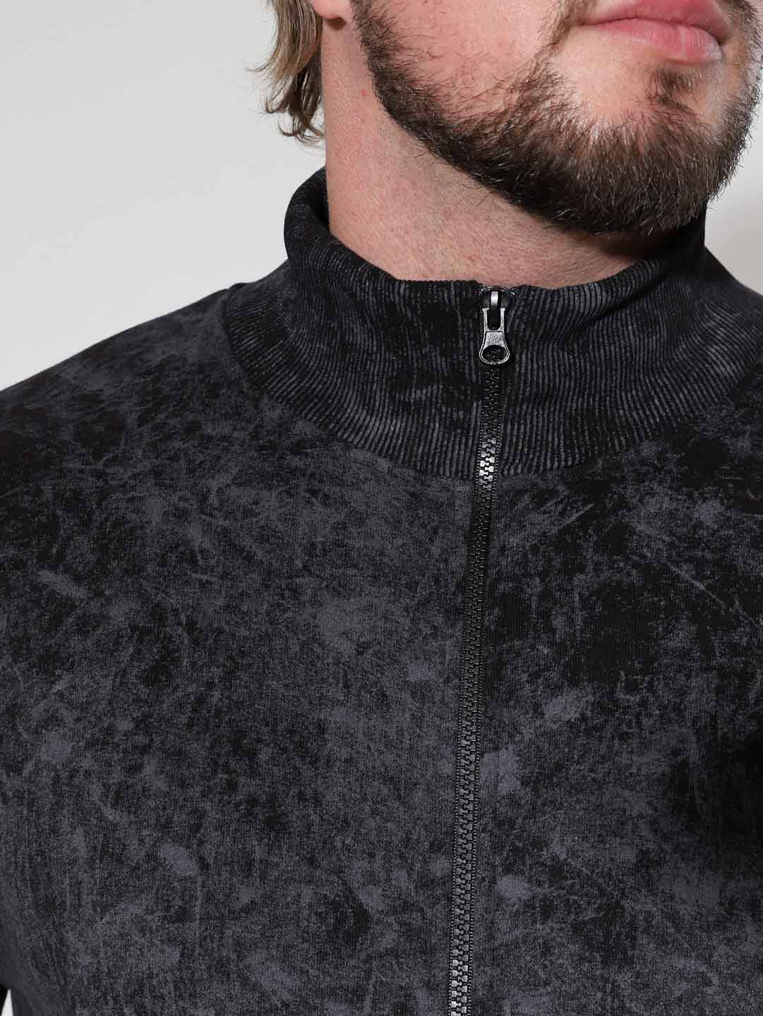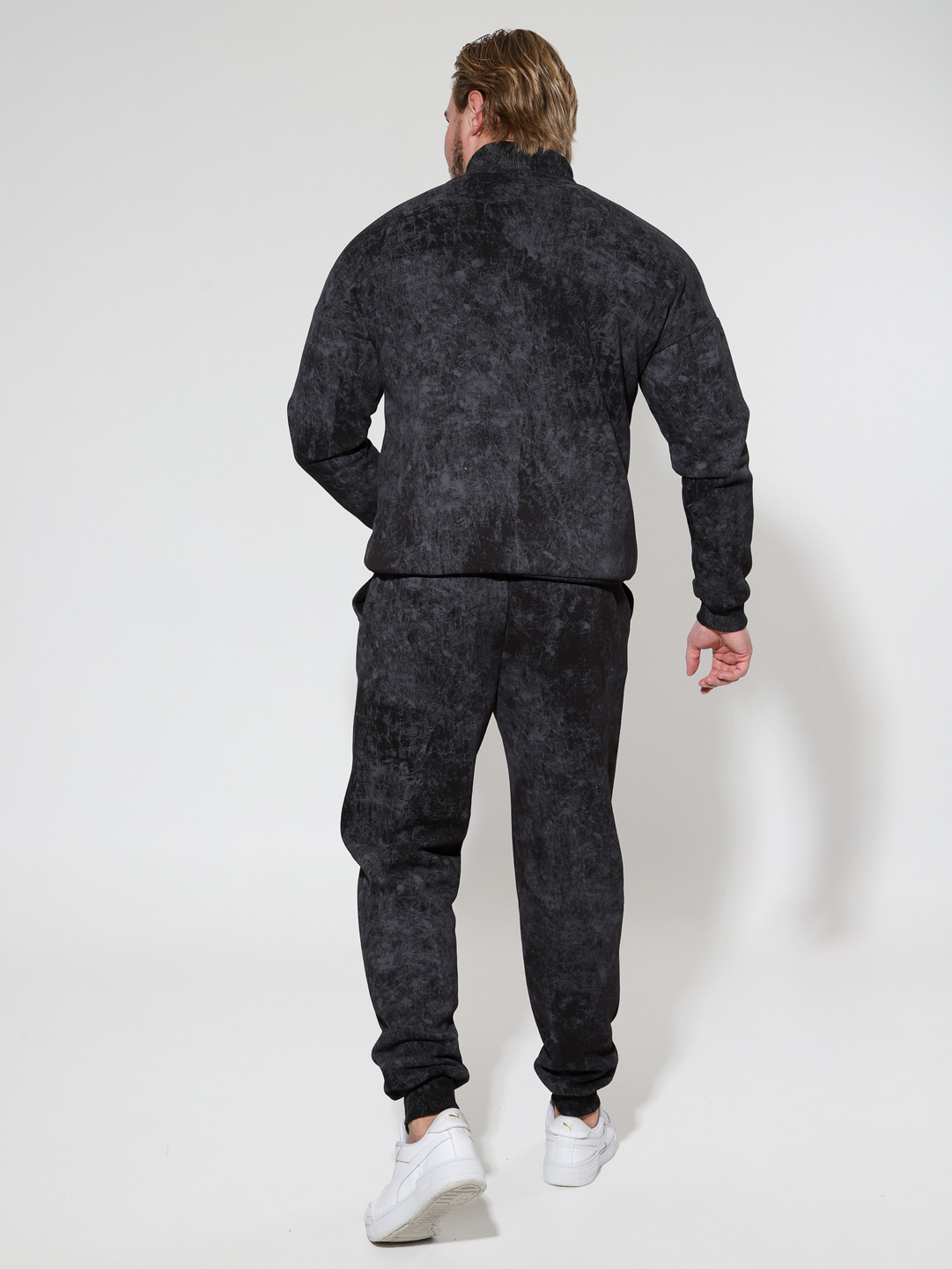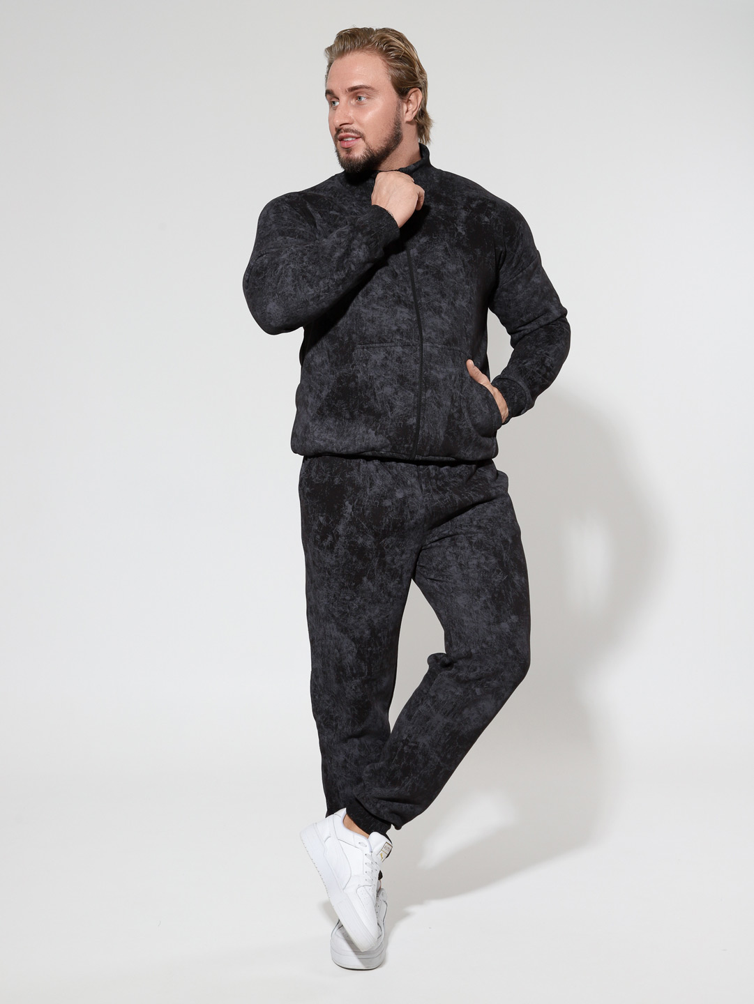 Утепленный мужской костюм из футера с начесом, с крашением варенка. Толстовка с высоким горлом на молнии, карманом кенгуру и манжетами из кашкорсе по низу рукавов и кофты. Брюки джоггеры с карманами в боковых швах, поясом на резинке с несколькими отстрочками и манжетами из кашкорсе по низу брюк.