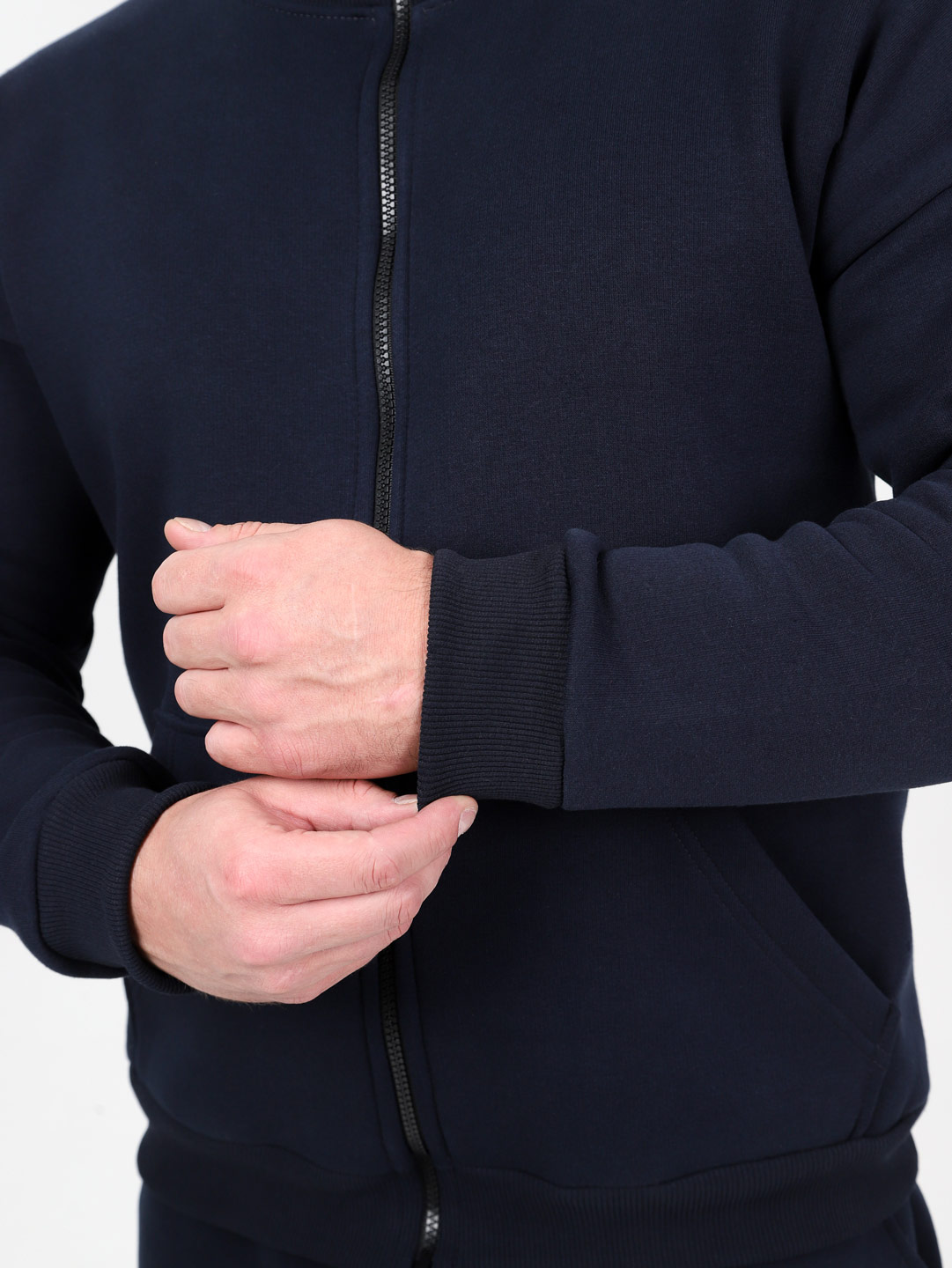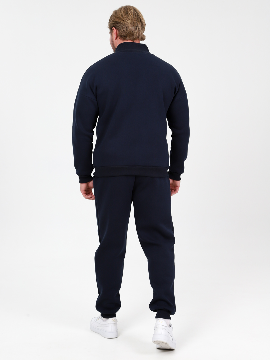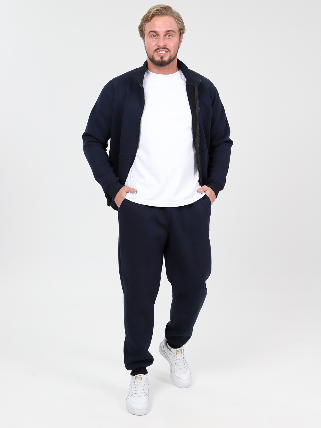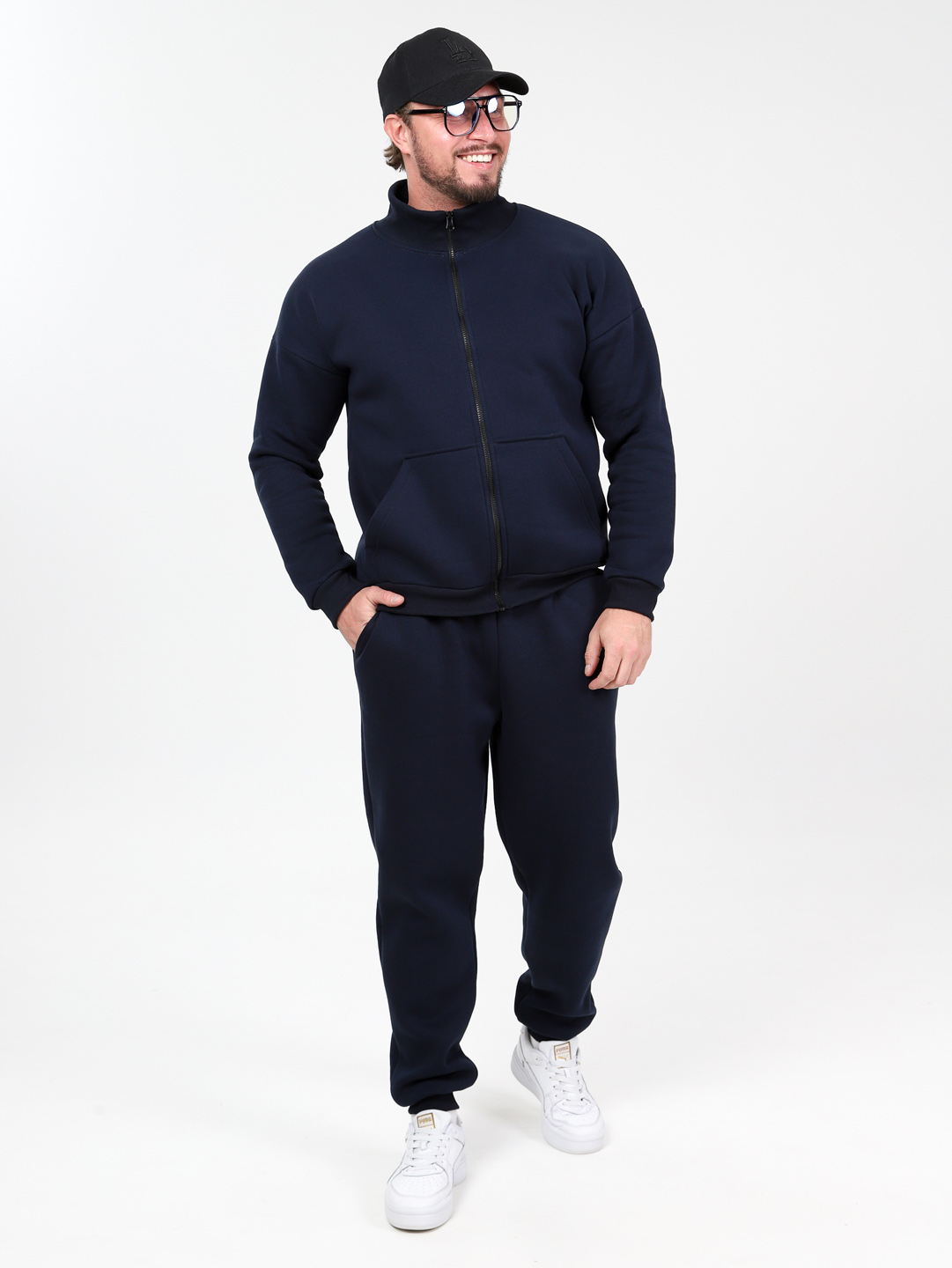 Утепленный мужской костюм из футера с начесом. Толстовка с высоким горлом на молнии, карманом кенгуру и манжетами из кашкорсе по низу рукавов и кофты. Брюки джоггеры с карманами в боковых швах, поясом на резинке с несколькими отстрочками и манжетами из кашкорсе по низу брюк.