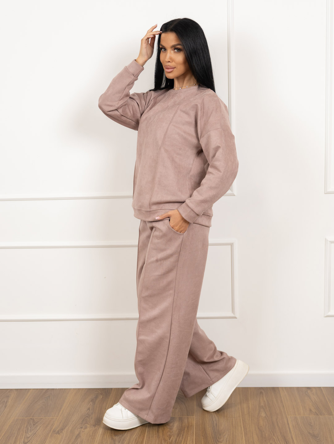 Брючный замшевый костюм из качественного приятного на ощупь полотна. Толстовка выполнена в стиле спорт шик со спущенным плечом, О-образной горловиной, стрелками на полочке и манженой по низу изделия и рукаву. Брюки прямого кроя, со стрелками и карманами в боковых швах, полной длины.