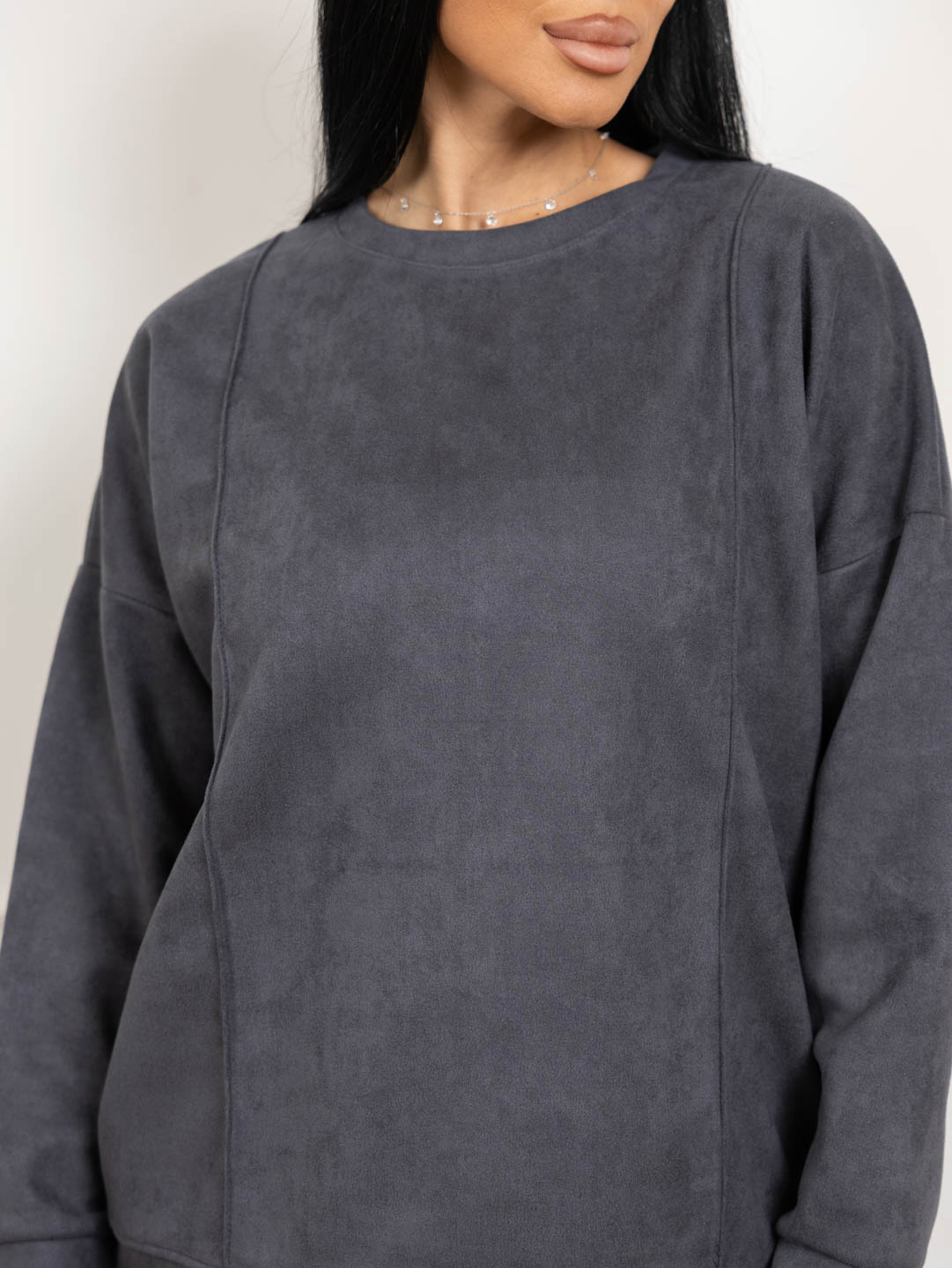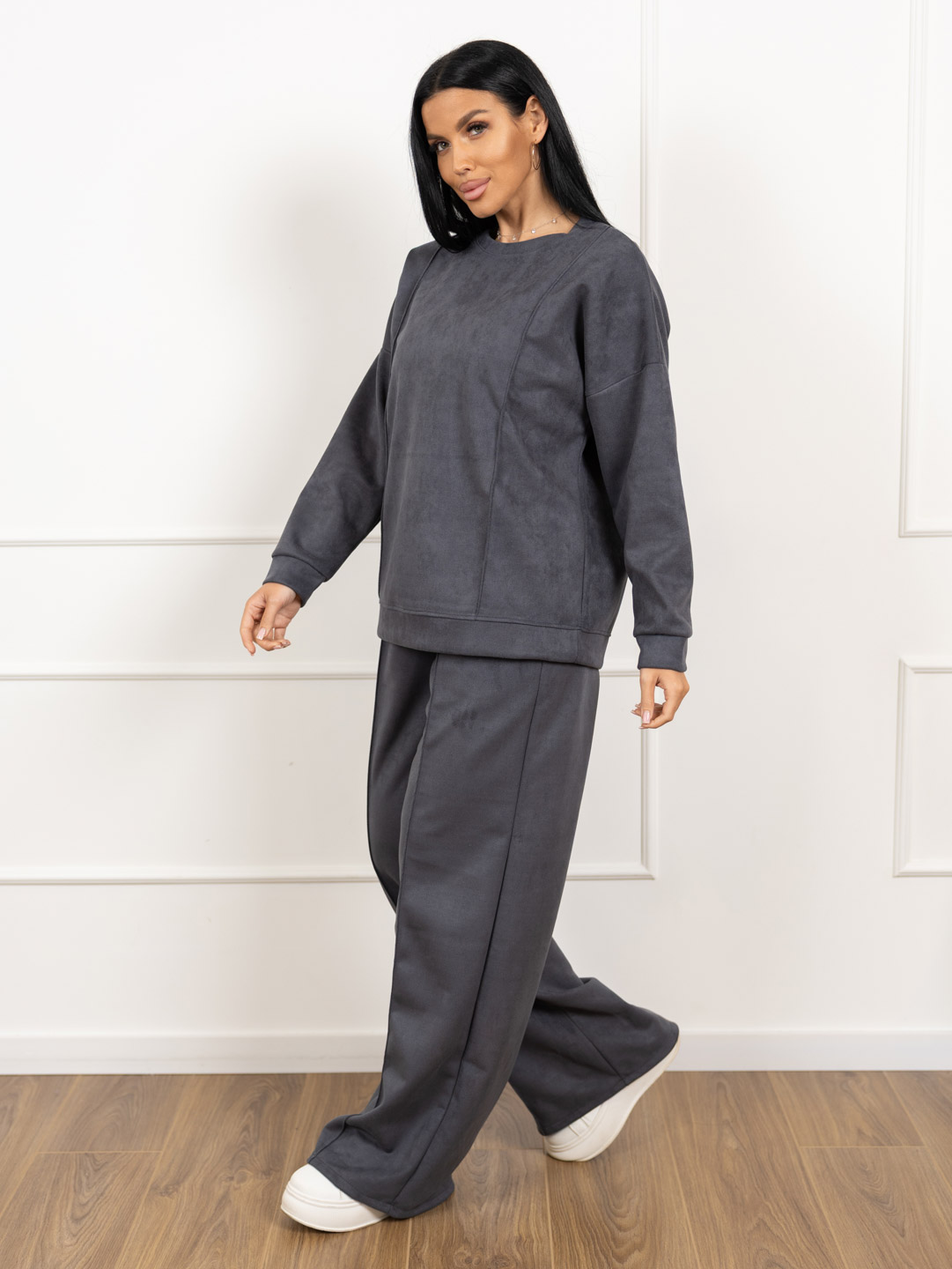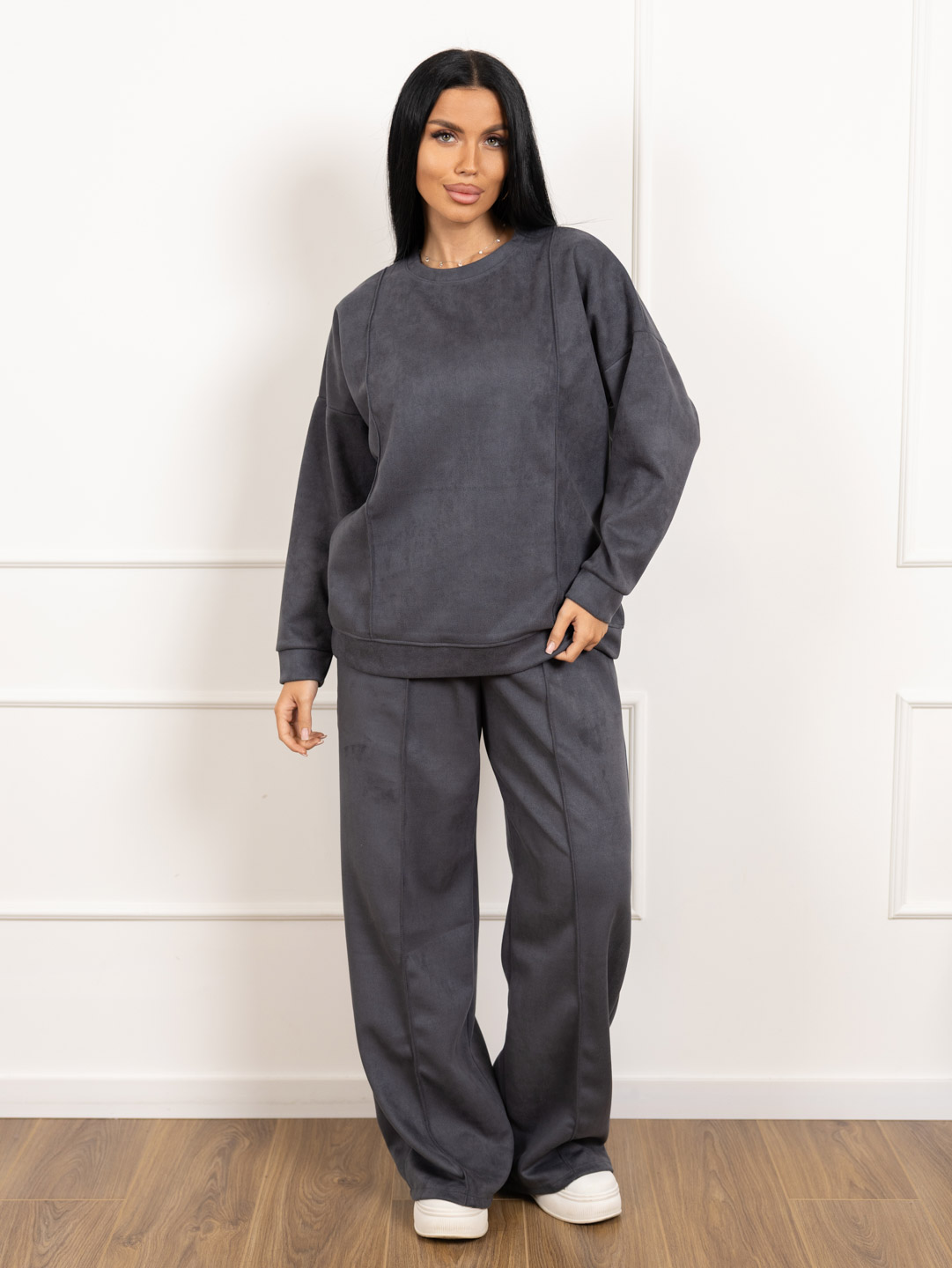Брючный замшевый костюм из качественного приятного на ощупь полотна. Толстовка выполнена в стиле спорт шик со спущенным плечом, О-образной горловиной, стрелками на полочке и манженой по низу изделия и рукаву. Брюки прямого кроя, со стрелками и карманами в боковых швах, полной длины.