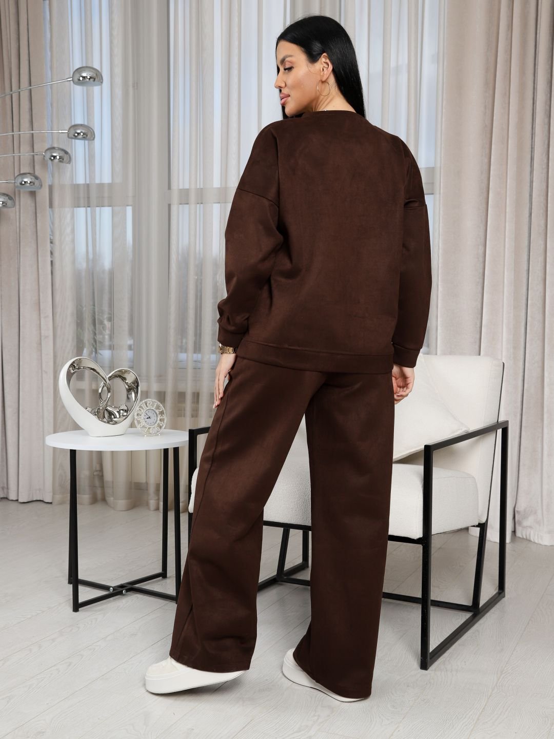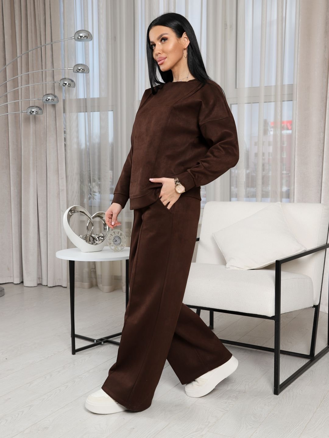 Брючный замшевый костюм из качественного приятного на ощупь полотна. Толстовка выполнена в стиле спорт шик со спущенным плечом, О-образной горловиной, стрелками на полочке и манженой по низу изделия и рукаву. Брюки прямого кроя, со стрелками и карманами в боковых швах, полной длины.