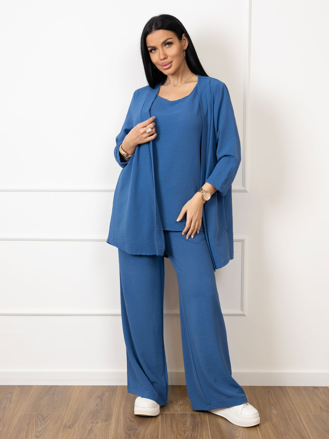 Летний женский костюм-тройка: стильное кимоно, майка и свободные брюки. Майка без рукавов,с О-образной горловиной, длиной до середены бедра. Накидка-кимоно с втачным рукавом длиной 3/4. Брюки палаццо с карманами в боковых швах и поясом с эластичной резинкой и отстрочкой на поясной машине.