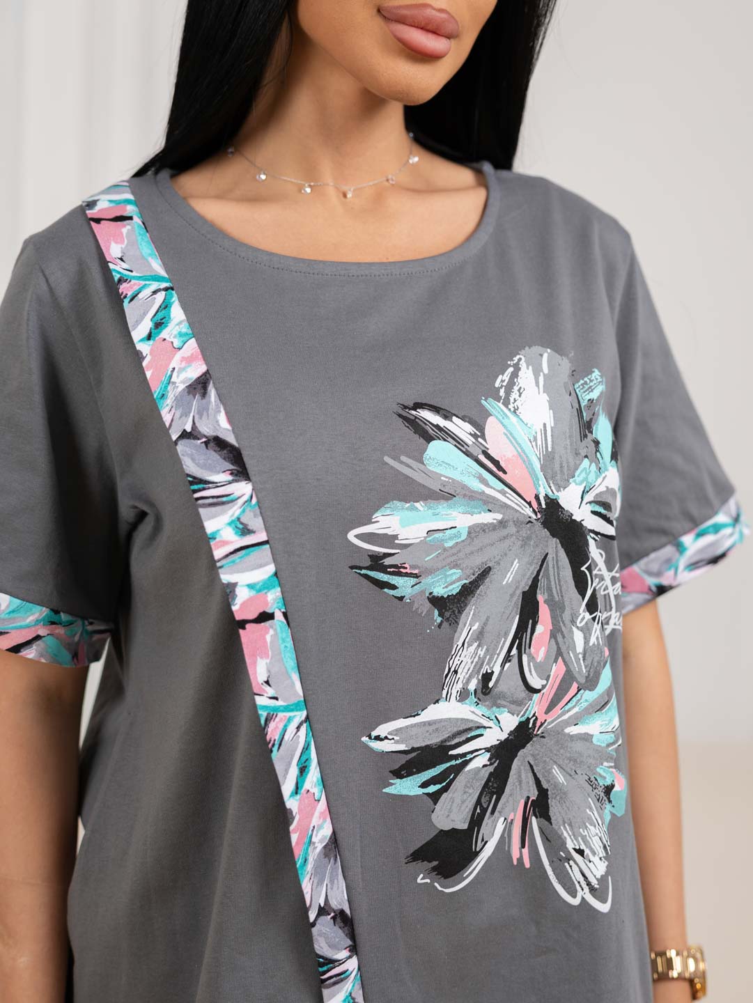 Дачный костюм из 100% хлопка. Футболка с печатью, О-образной горловиной и коротким рукавом. Бриджи выполнены из ткани компаньона, длиной чуть ниже колена, с разрезами по боковым швам и карманами.