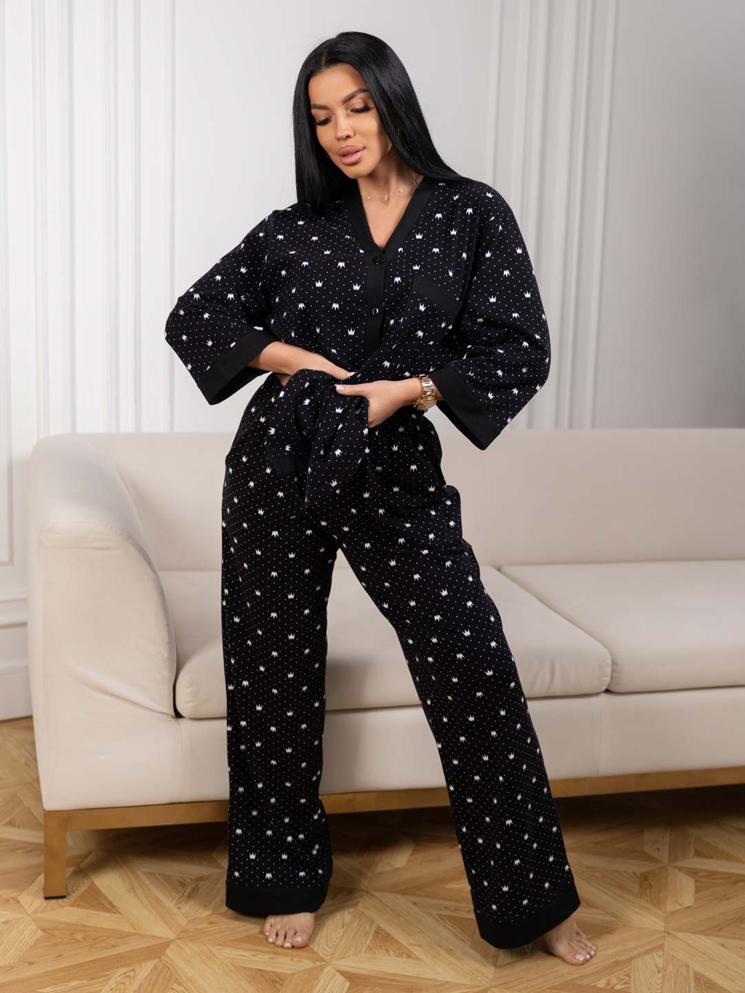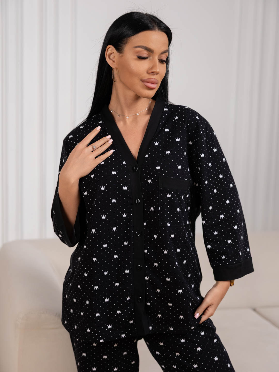 Женский домашний костюм из хлопка. Верх на пуговицах с рукавом 3/4, накладным карманом. Брюки на резинке, с карманами в боковых швах.