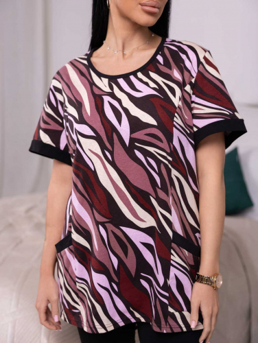 Костюм женский из комбинированного трикотажного полотна, состоящий из бридж и кофты. Кофта полуприлегающего силуэта длинной чуть ниже уровня бёдер из набивного трикотажного полотна с отделкой в цвет бридж. Полочка с рельефами и двумя накладными карманами, на которых имеются планки из отделочного материала. Рукав втачной короткий. Вырез горловины О-образный. Бриджи из однотонного трикотажного полотна длинной ниже уровня колена.