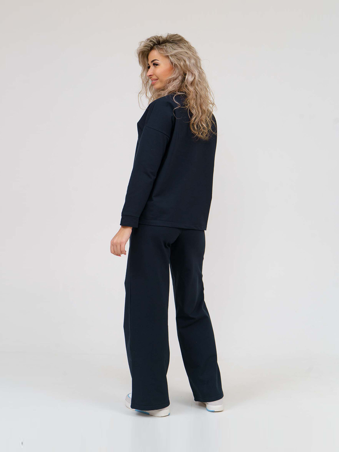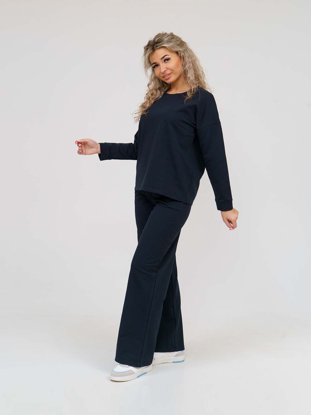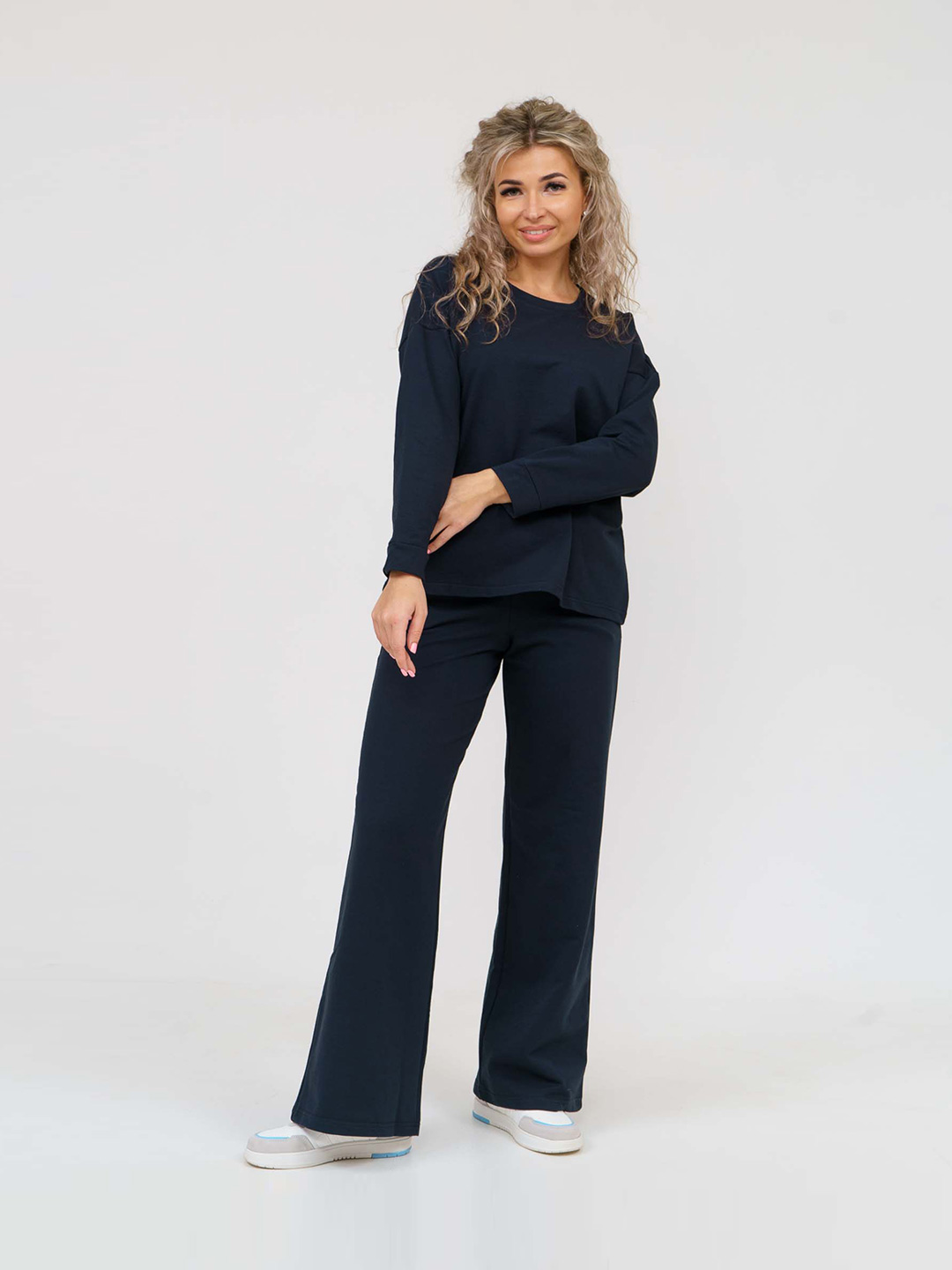 Молодежный костюм из футера. Толстовка "oversize" со спущенной линией плеча, длинным рукавом с манжетой и О-образной горловиной. Широкие брюки на резинке с высокой посадкой, боковые карманы с отрезным бочком. Материал — футер без начеса, идеальный вариант на весну и лето.