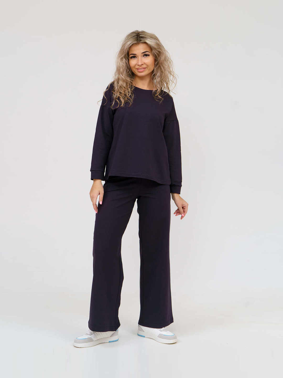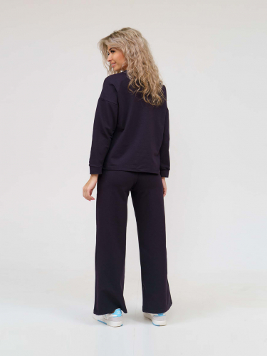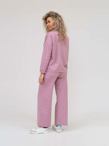 Молодежный костюм из футера. Толстовка "oversize" со спущенной линией плеча, длинным рукавом с манжетой и О-образной горловиной. Широкие брюки на резинке с высокой посадкой, боковые карманы с отрезным бочком. Материал — футер без начеса, идеальный вариант на весну и лето.