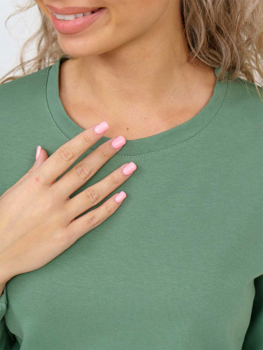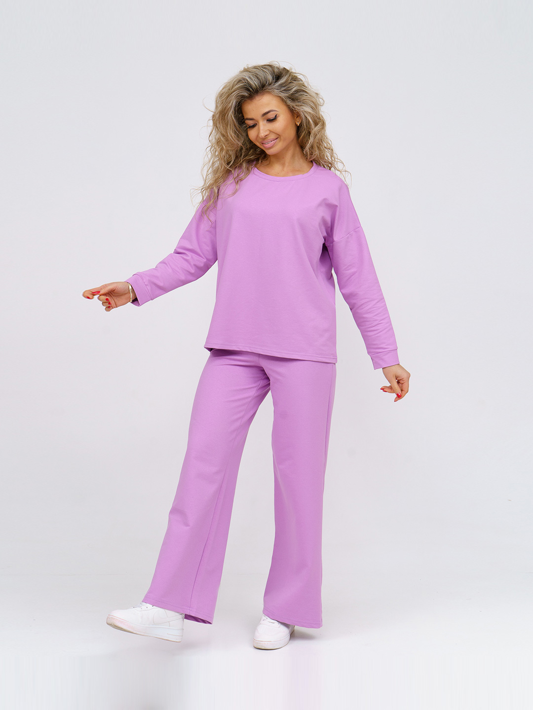 Молодежный костюм из футера. Толстовка "oversize" со спущенной линией плеча, длинным рукавом с манжетой и О-образной горловиной. Широкие брюки на резинке с высокой посадкой, боковые карманы с отрезным бочком. Материал — футер без начеса, идеальный вариант на весну и лето.