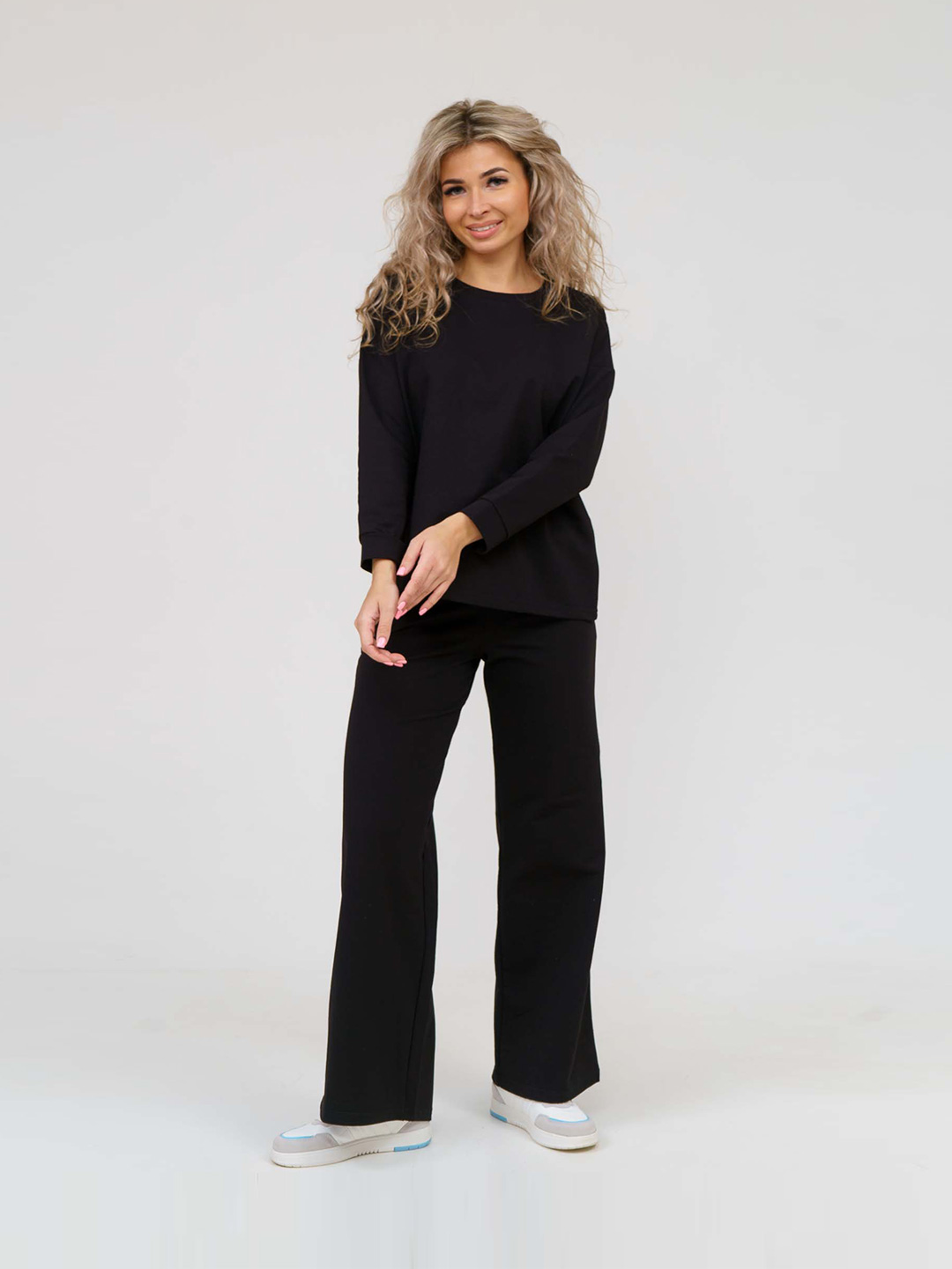 Молодежный костюм из футера. Толстовка "oversize" со спущенной линией плеча, длинным рукавом с манжетой и О-образной горловиной. Широкие брюки на резинке с высокой посадкой, боковые карманы с отрезным бочком. Материал — футер без начеса, идеальный вариант на весну и лето.