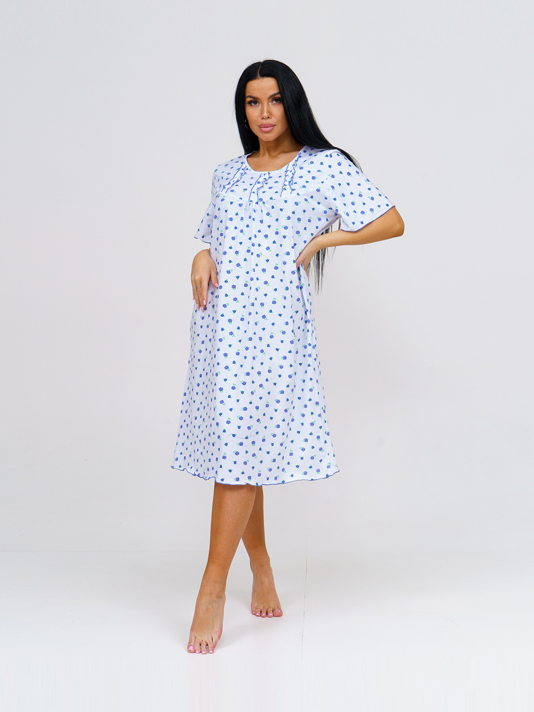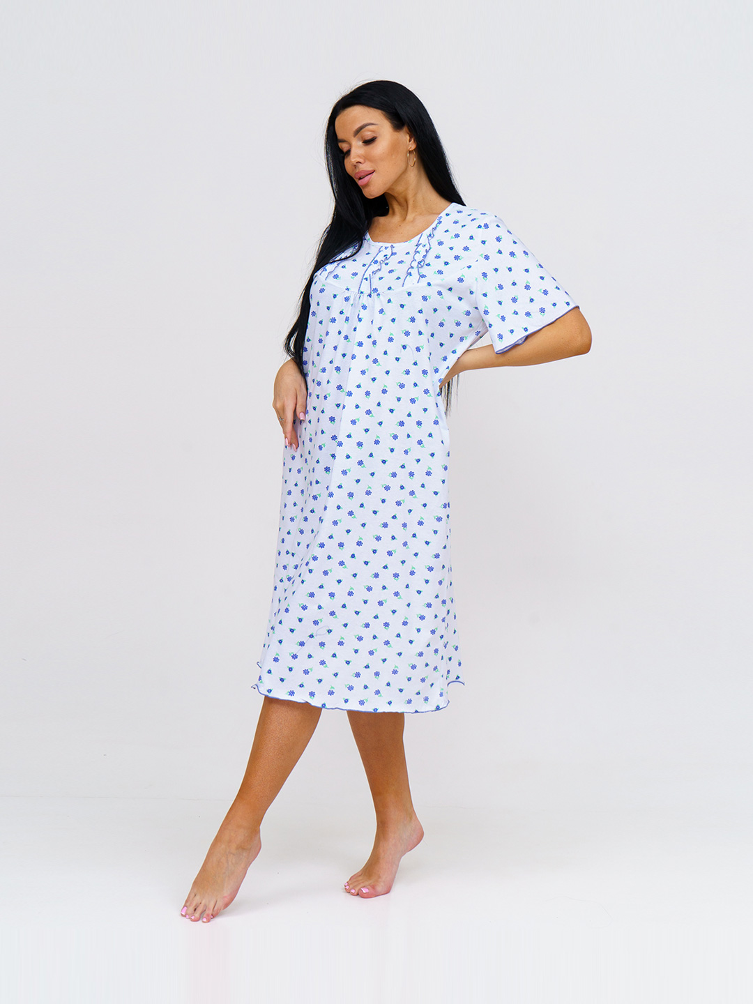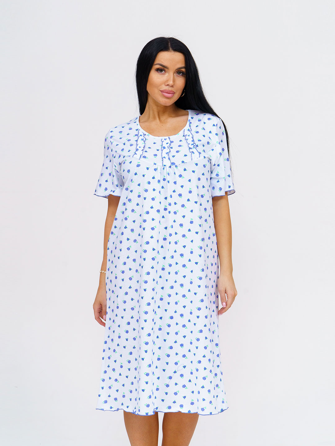 Ночная женская сорочка из хлопка длиной ниже колена, свободной силуэтной формы с коротким рукавом. Спереди кокетка с рюшем. В нашей сорочке Вы будете чувствовать себя комфортно во время сна.