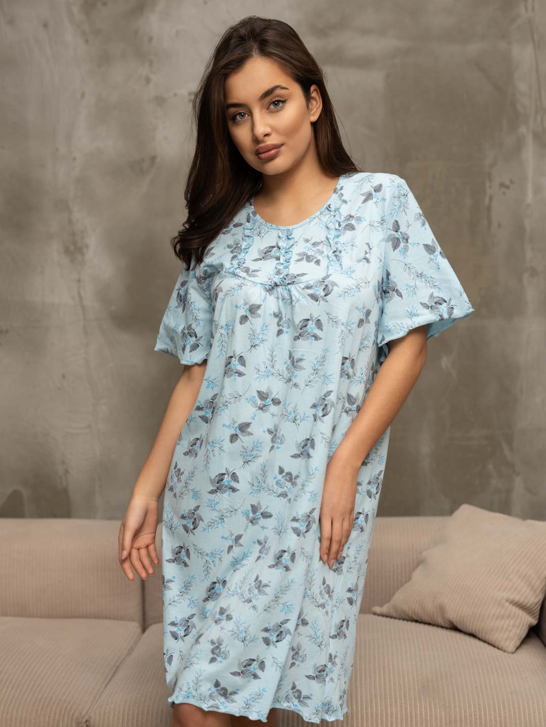 Ночная женская сорочка из хлопка длиной ниже колена, свободной силуэтной формы с коротким рукавом. Спереди кокетка с рюшем. В нашей сорочке Вы будете чувствовать себя комфортно во время сна.
