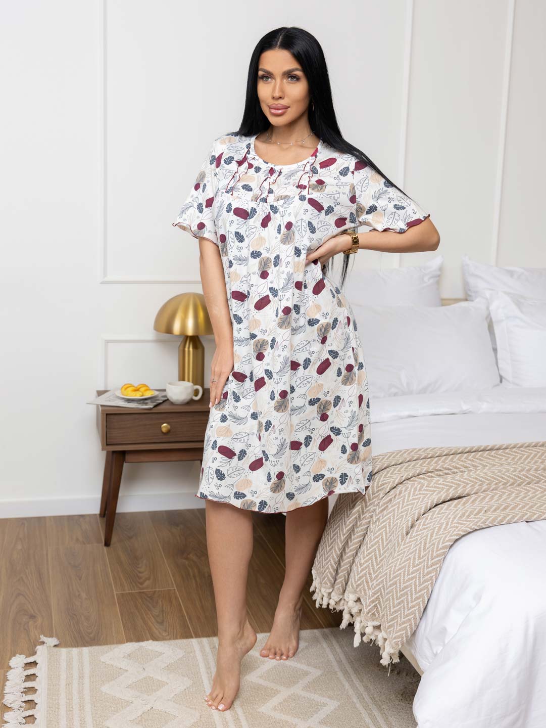 Ночная женская сорочка из хлопка длиной ниже колена, свободной силуэтной формы с коротким рукавом. Спереди кокетка с рюшем. В нашей сорочке Вы будете чувствовать себя комфортно во время сна.