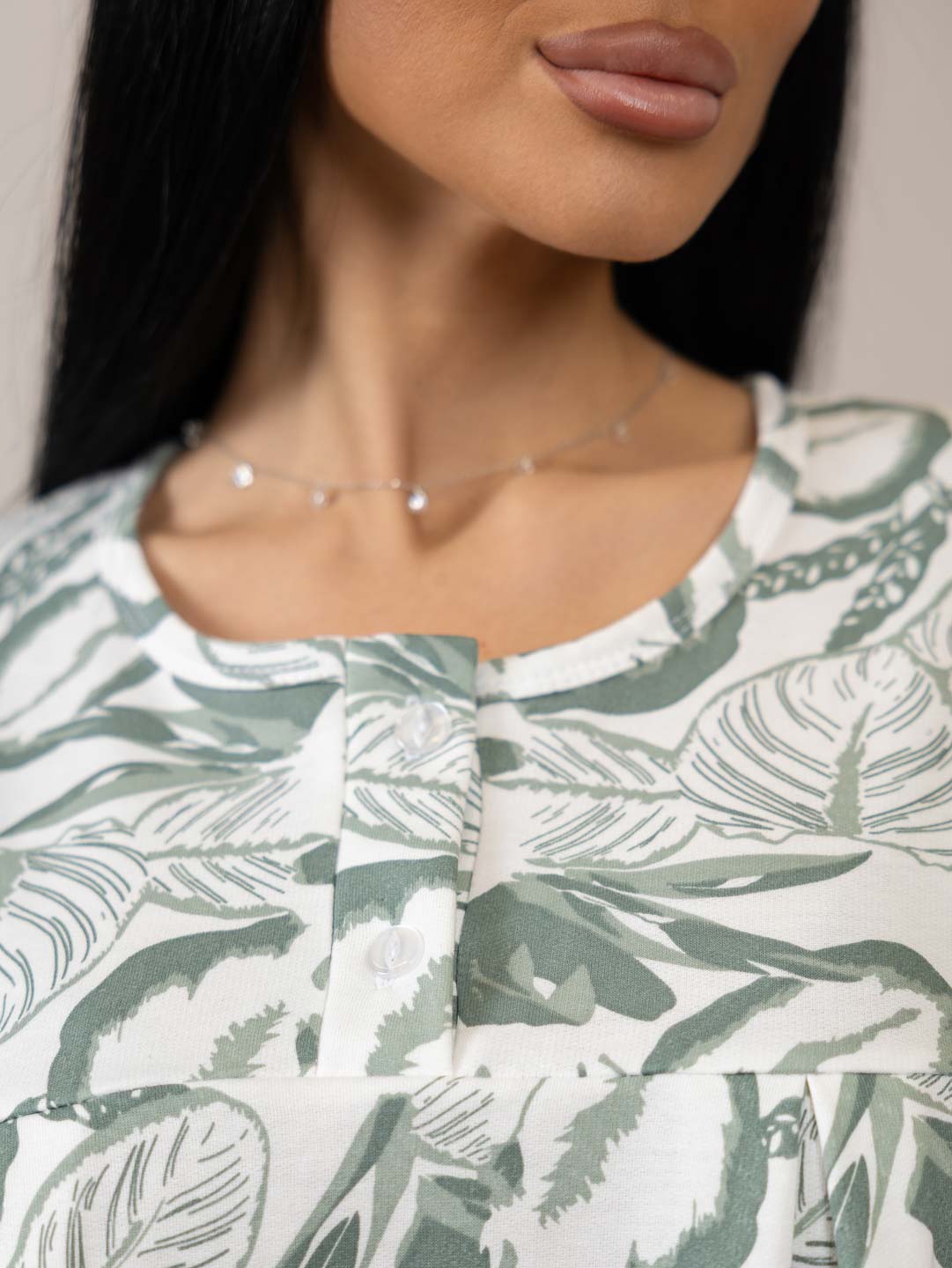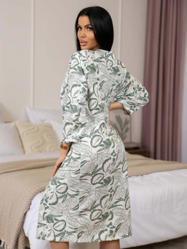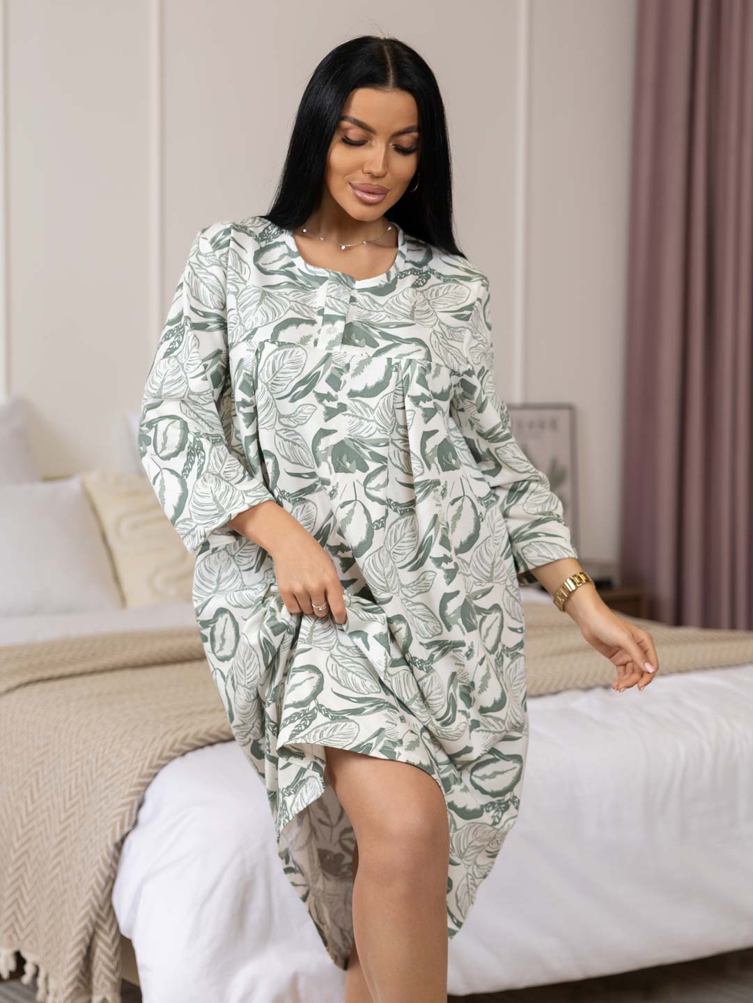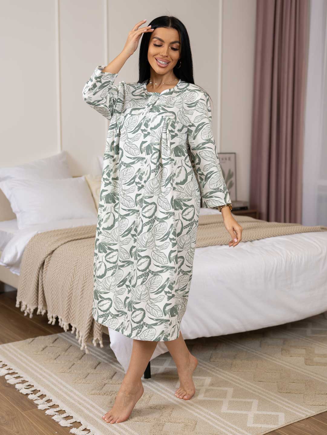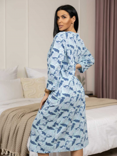 Женская ночная сорочка длиной ниже колена с рукавом 3/4 и округлой горловиной на пуговицах. Материал имеет притную к телу изнанку, благодаря которой вы не замерзните даже в самые морозные дни.