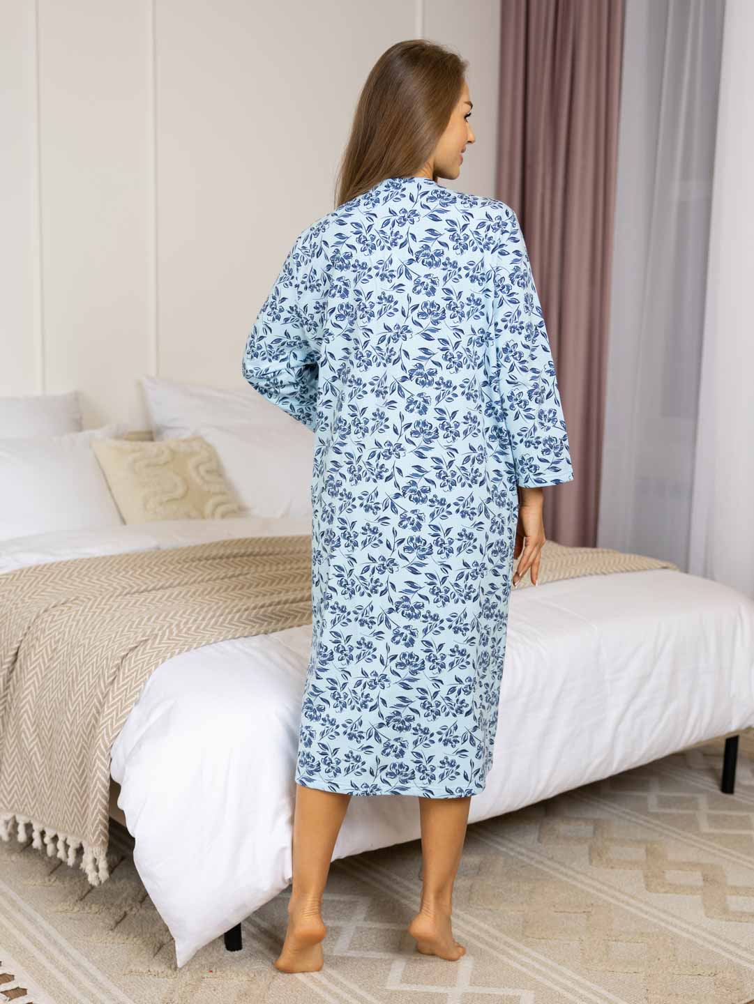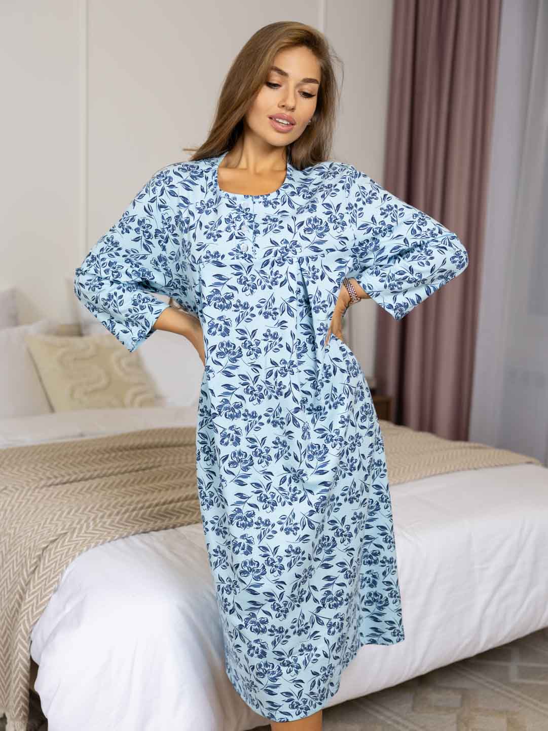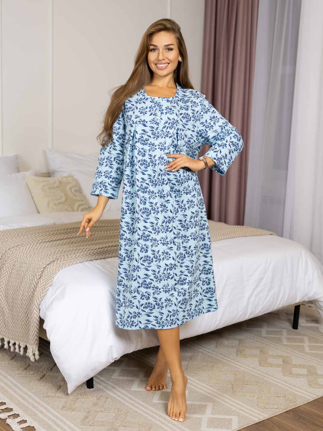 Женская ночная сорочка длиной ниже колена с рукавом 3/4 и округлой горловиной на пуговицах. Материал имеет прияную к телу изнанку, благодаря которой вы не замерзните даже в самые морозные дни.