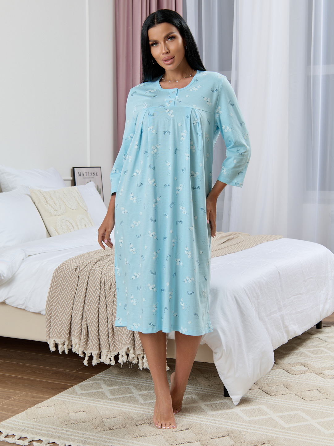 Ночная женская сорочка из кулирки, свободного силуэта, длиной ниже колена. Вырез горловины О-образный.