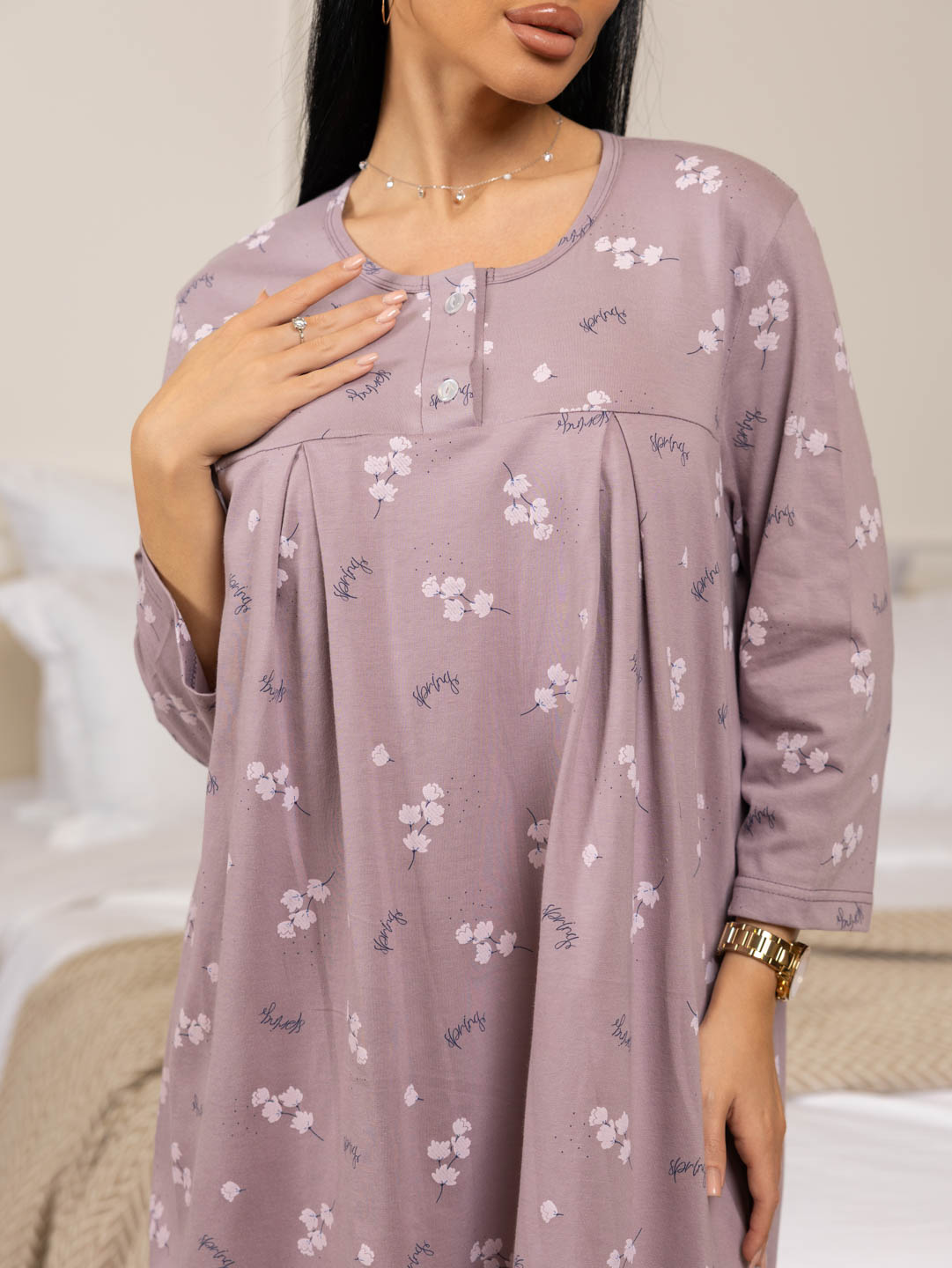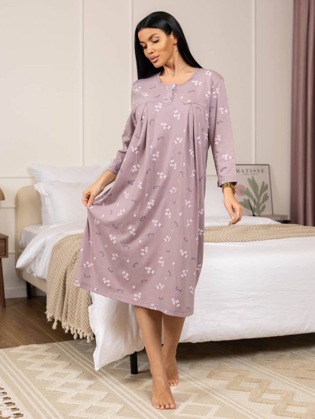 Ночная женская сорочка из кулирки, свободного силуэта, длиной ниже колена. Вырез горловины О-образный.