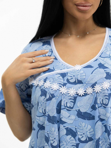 Ночная сорочка женская из трикотажного полотна - кулирка, прямого силуэта, с притачной кокеткой по верху переда, со складками по линии соединения кокетки и полочки, поверх шва соединения кокетки и полочки нашита декоративная тесьма с ромашками. Вырез горловины О-образный и обработан окантовкой. Рукав втачной, базового покроя, короткий.