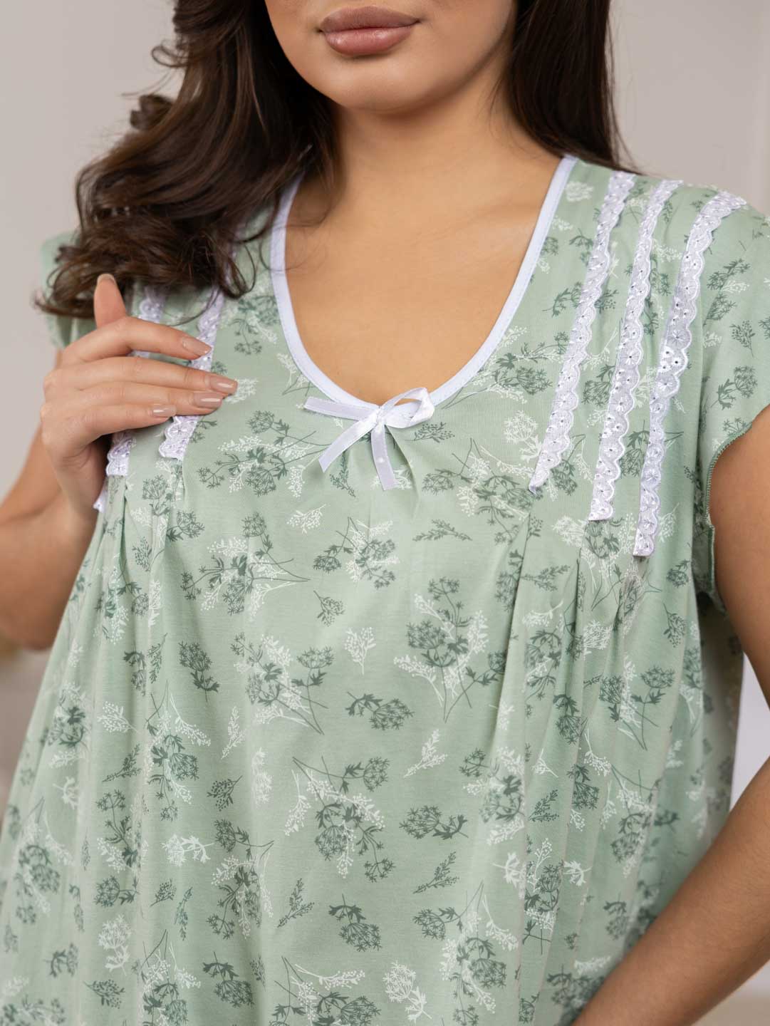Сорочка женская для сна, длиной чуть ниже уровня колена. С округлым вырезом и коротким втачным рукавом. На передней части декоративные элементы в виде кружева и бантика.