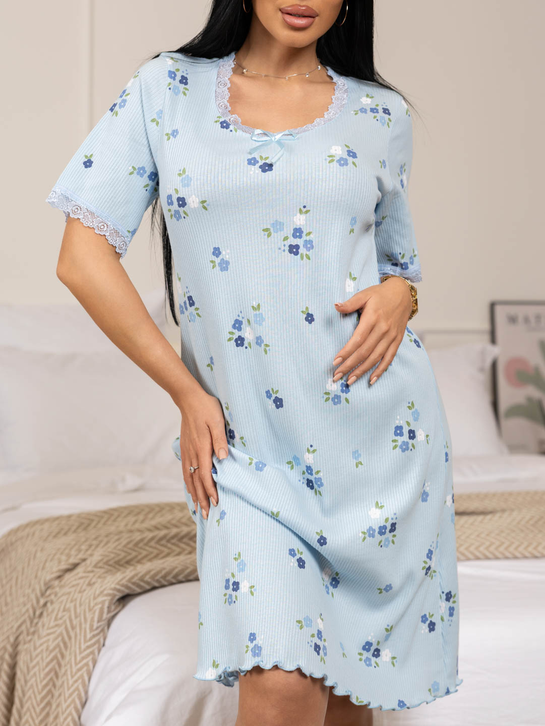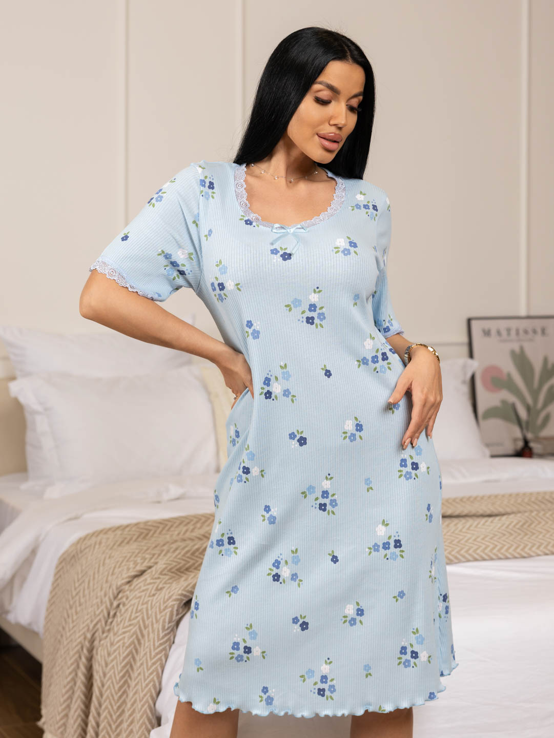 Ночная сорочка из хлопкового кашкорсе с набивыным рисунком, О-образной горловиной, коротким втачным рукавом, длиной чуть ниже колена. Горловина и край рукава украшены кружевом. Подол обработан роликовым швом, контрастными нитками в цвет рисунка.