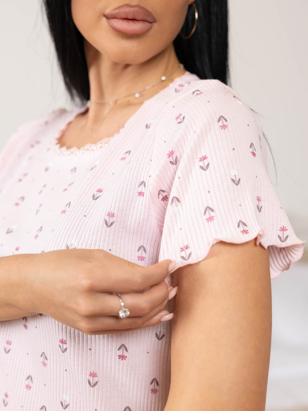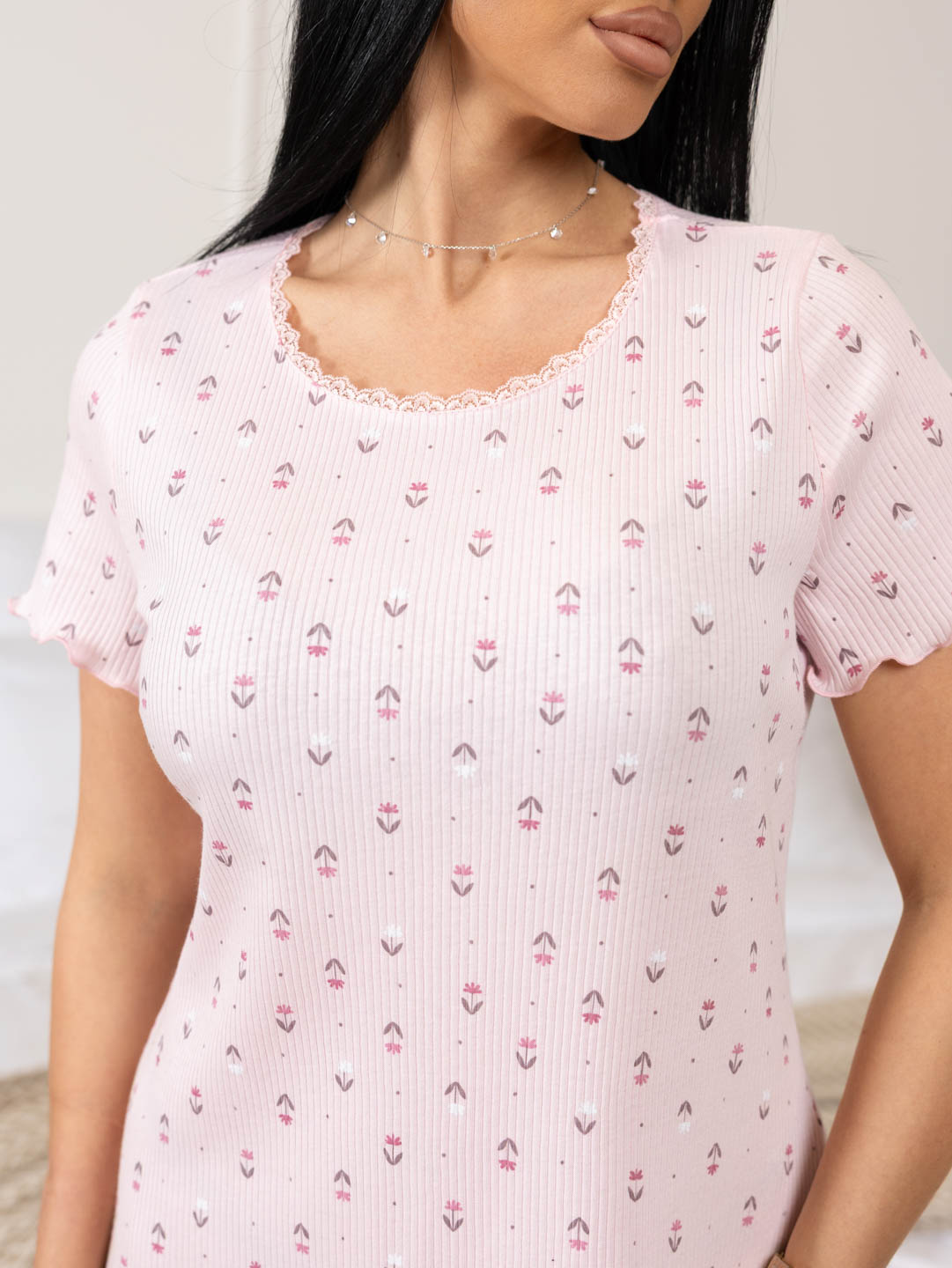 Ночная сорочка из хлопкового кашкорсе с набивыным рисунком, О-образной горловиной украшенной тонким кружевом в цвет основы ткани, коротким втачным рукавом, длиной до колена. Низ рукава и подол обработаны роликовым швом, нитки подобраны в цвет основы ткани.