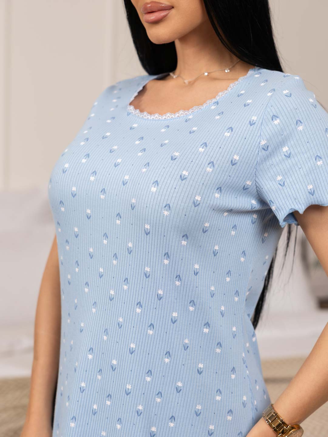 Ночная сорочка из хлопкового кашкорсе с набивыным рисунком, О-образной горловиной украшенной тонким кружевом в цвет основы ткани, коротким втачным рукавом, длиной до колена. Низ рукава и подол обработаны роликовым швом, нитки подобраны в цвет основы ткани.