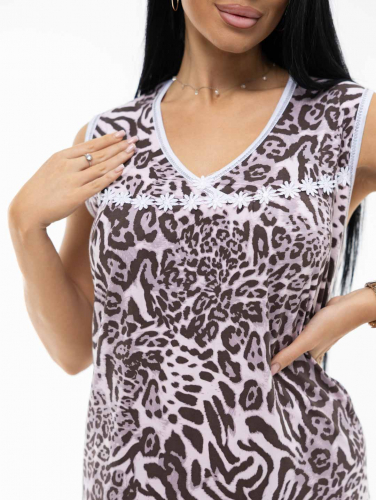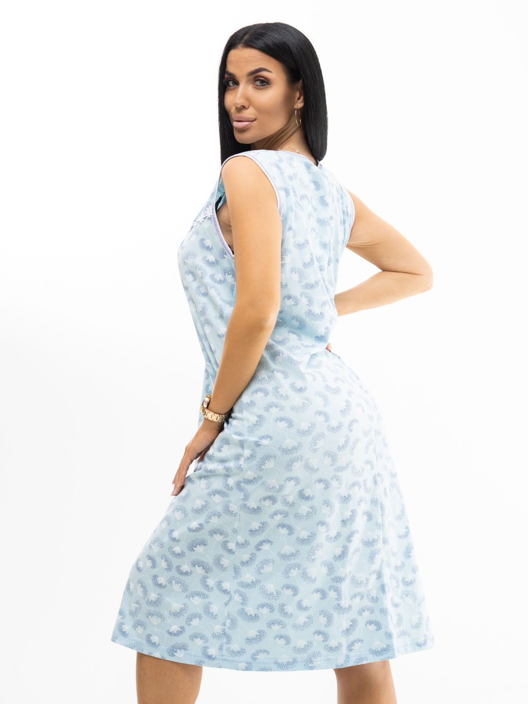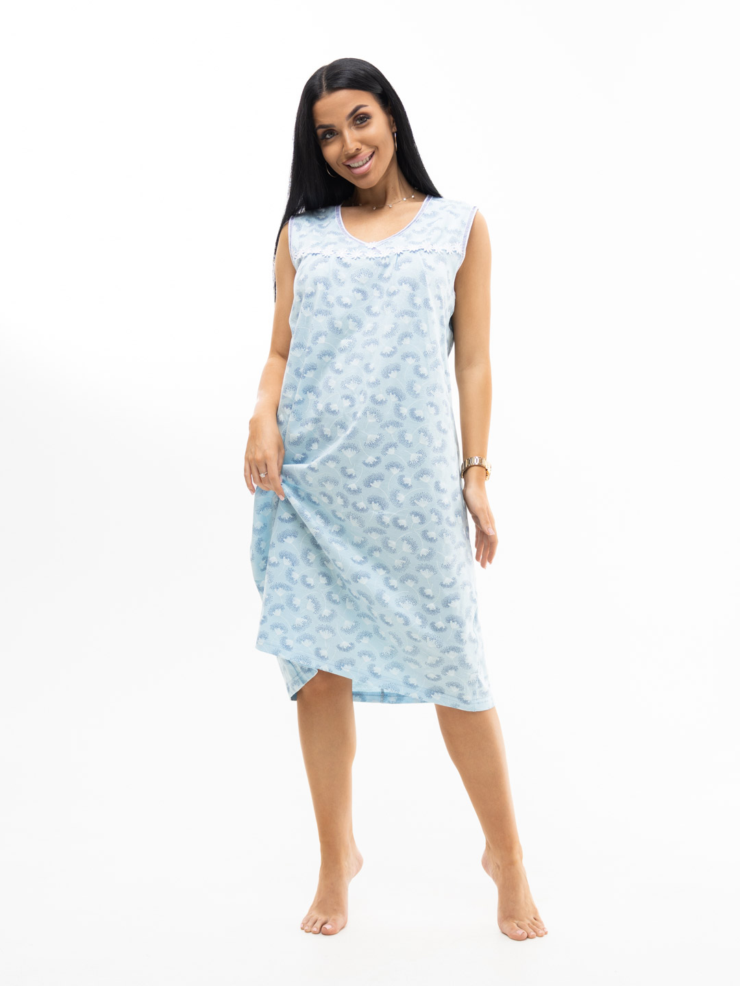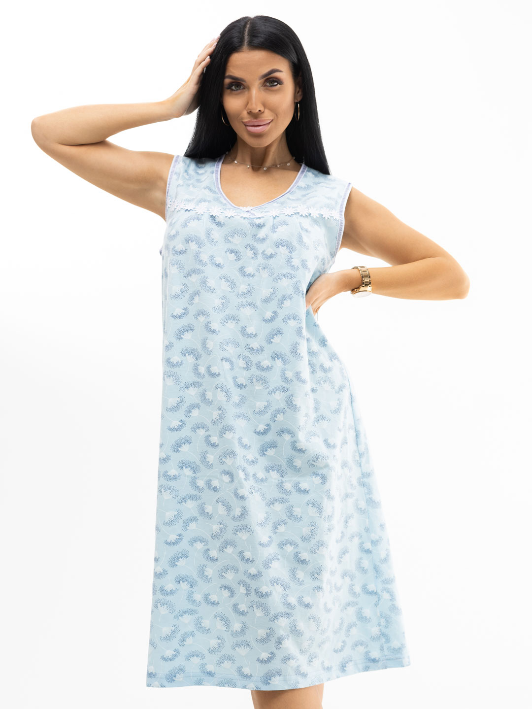 Ночная женская сорочка из хлопка, свободного силуэта, длиной ниже колена. Спереди кокетка отделанная шитьем, вырез горловины V-образный.