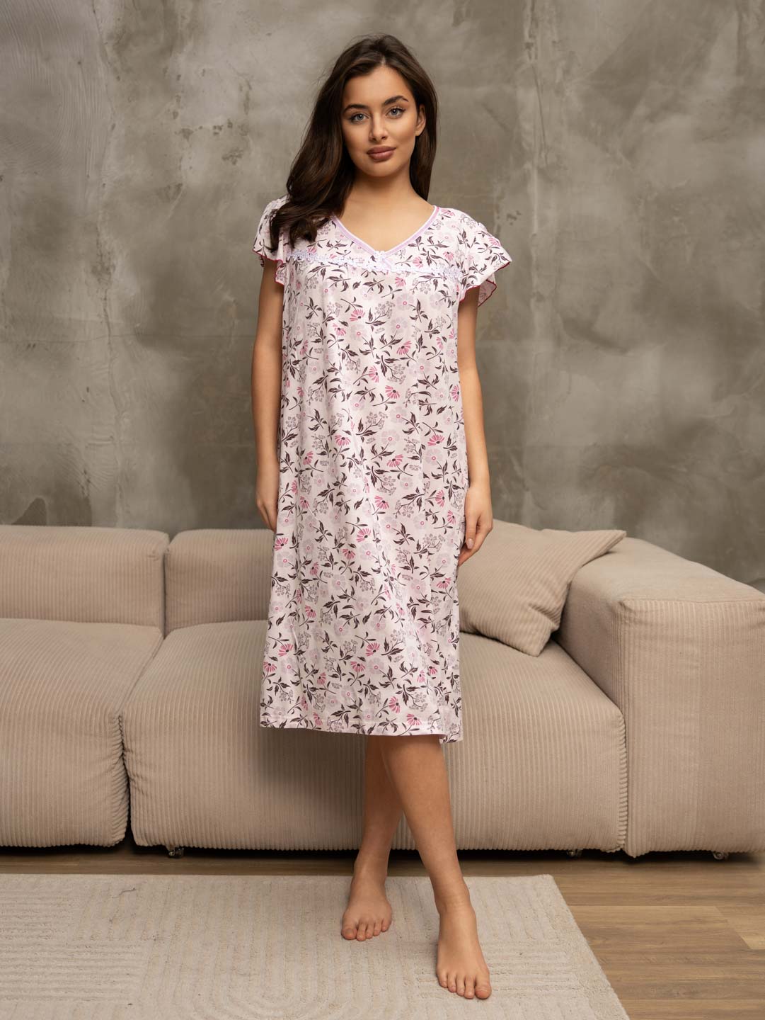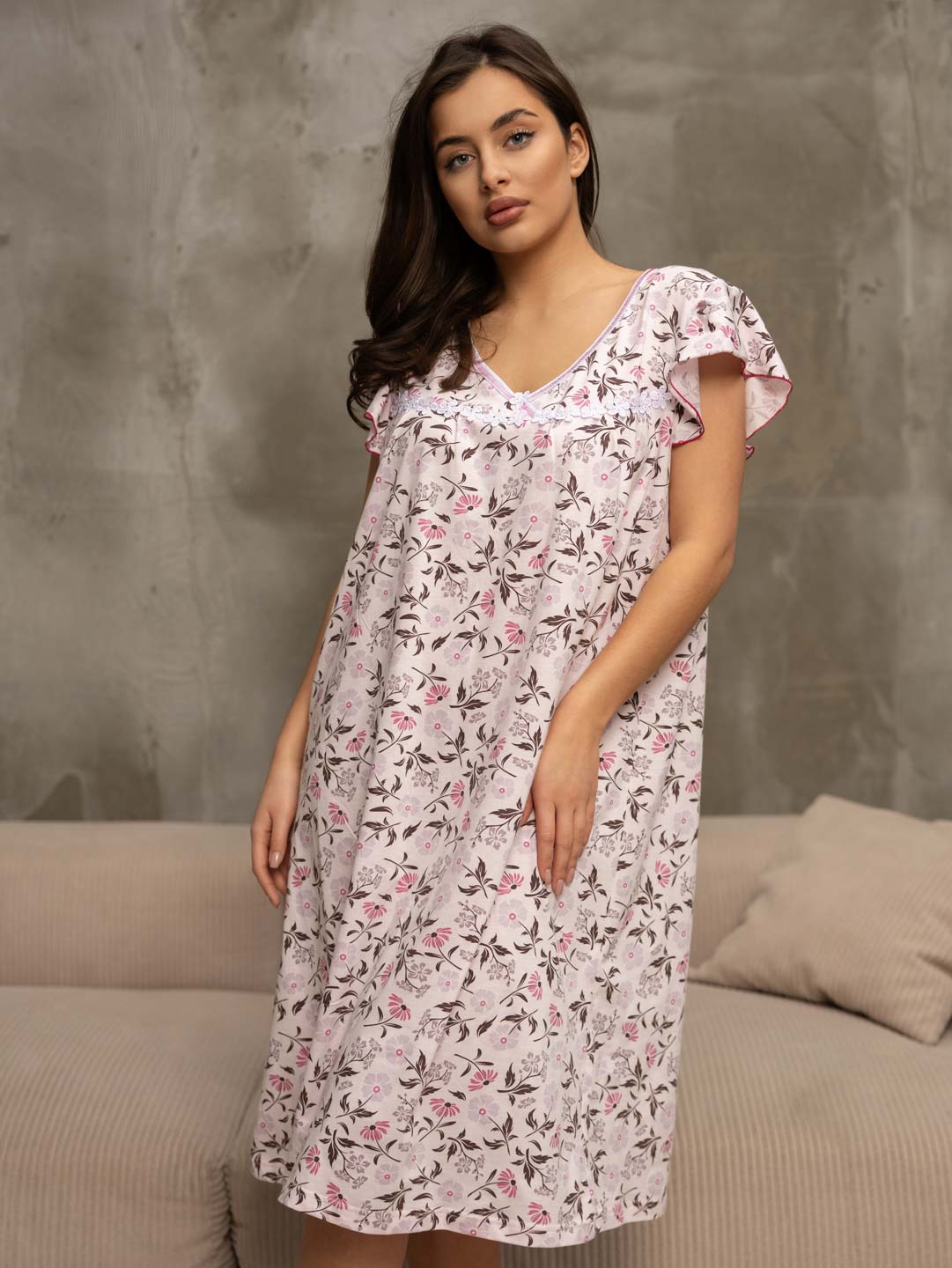 Женская ночная сорочка из хлопка, длиной ниже колена, с рукавом воланом и V-образной горловиной, украшена кружевом. Материал приятный к телу, обеспечивает комфорт во время сна.