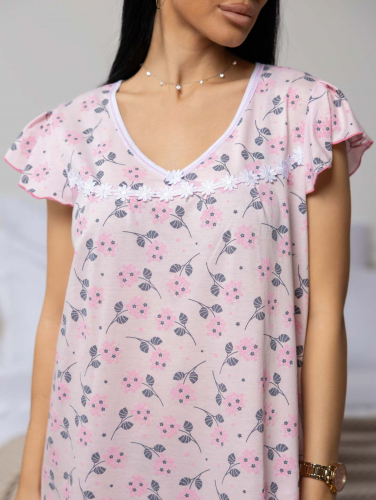 Женская ночная сорочка из хлопка, длиной ниже колена, с рукавом воланом и V-образной горловиной, украшена кружевом. Материал приятный к телу, обеспечивает комфорт во время сна.