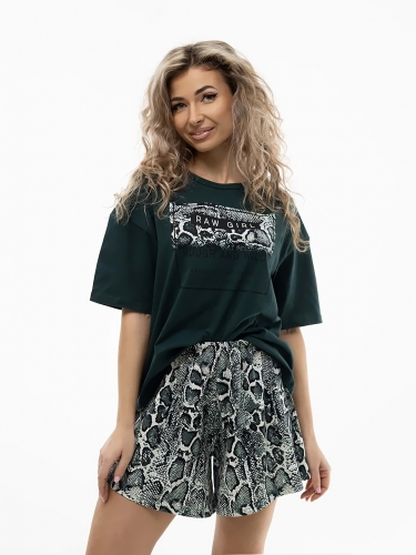 Стильная молодежная пижама с футболкой и юбкой-шортами. Футболка с О-образной горловиной, спущенной линией плеча и печатью спереди. Юбка-шорты имеют трапециевидный крой, выполнены без карманов, на резинке 2см. Костюм сшит из турецкой кулирки, которая отличается мягкостью.