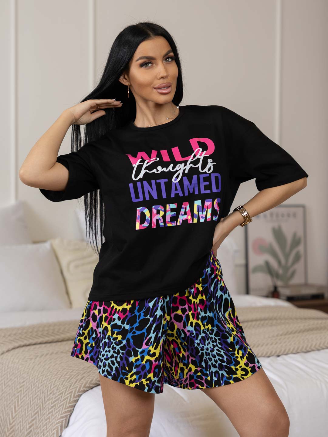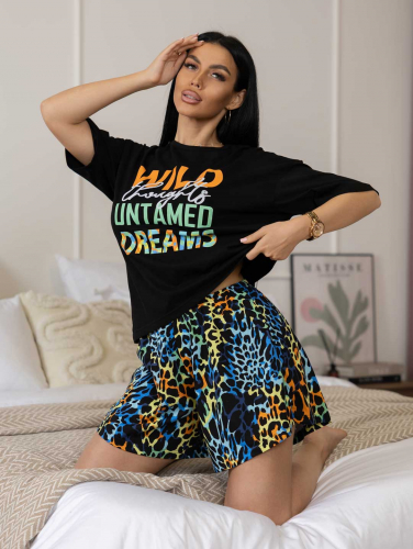 Стильная молодежная пижама с футболкой и юбкой-шортами. Футболка с О-образной горловиной, спущенной линией плеча и печатью спереди. Юбка-шорты имеют трапециевидный крой, выполнены без карманов, на резинке 2см. Костюм сшит из турецкой кулирки, которая отличается мягкостью.