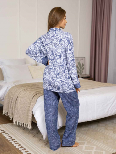 Женская пижама из футера ничеса, верх кубашка с отложным воротником на пуговицах, рукав длинный с манжетой в цвет брюк. Брюки прямые полной длины на резинке без карманов с манжетами по низу, при необходимости можно отогнуть манжеты и сделать брюки длиной 7/8.