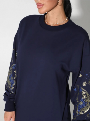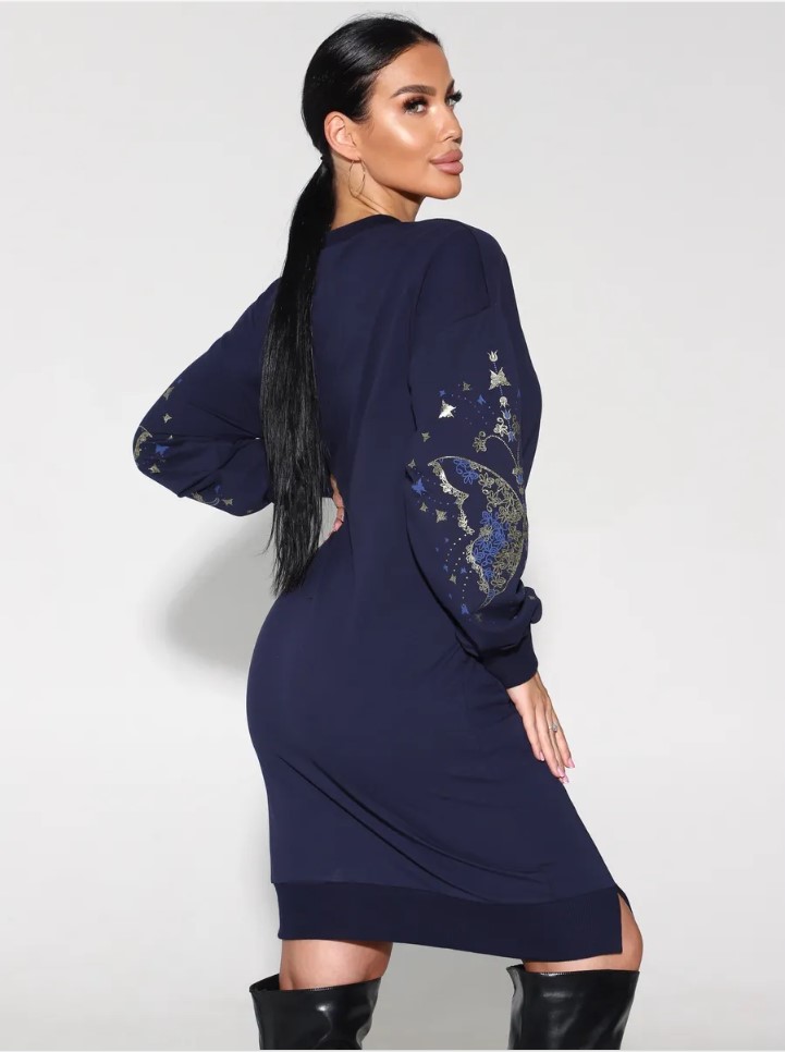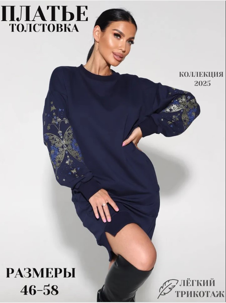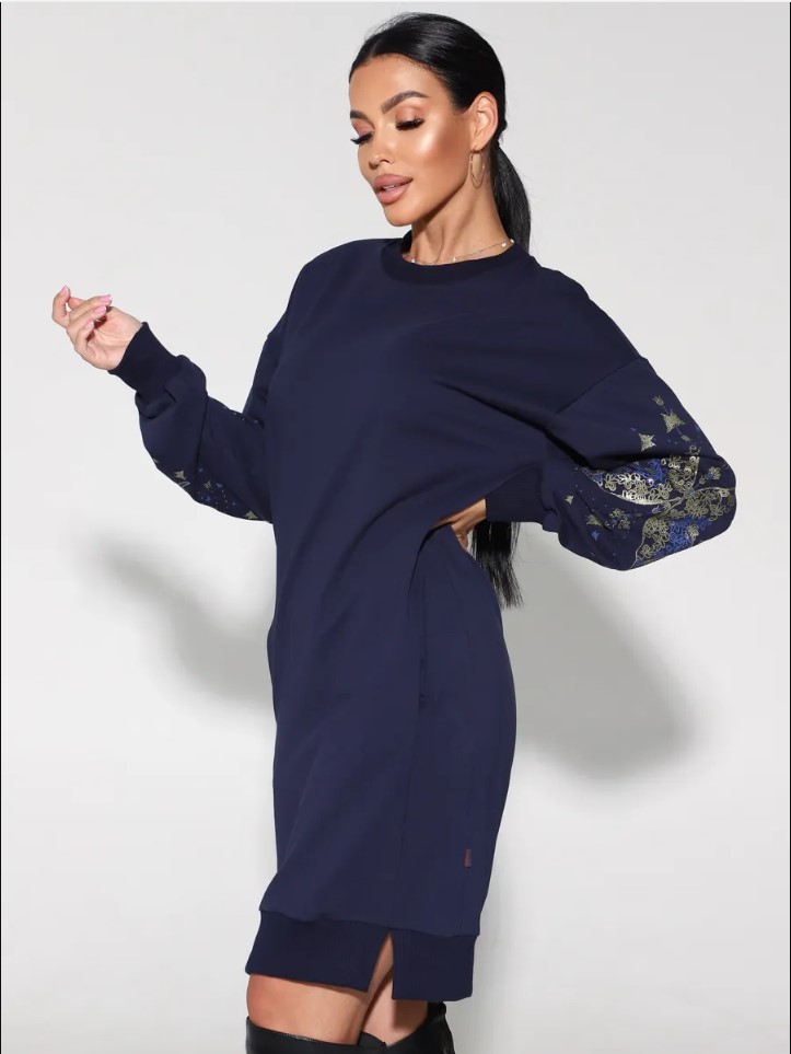 Женское платье толстовка из качественного турецкого футера с принтом-блестками. Платье имеет О-образную горловину и широкой обтачкой из кашкорсе, спущенное плечо с манжетой по рукаву, карманы в боковых швах и небольшие разрезы по низу изделия спереди.