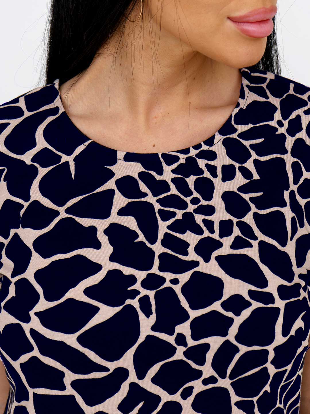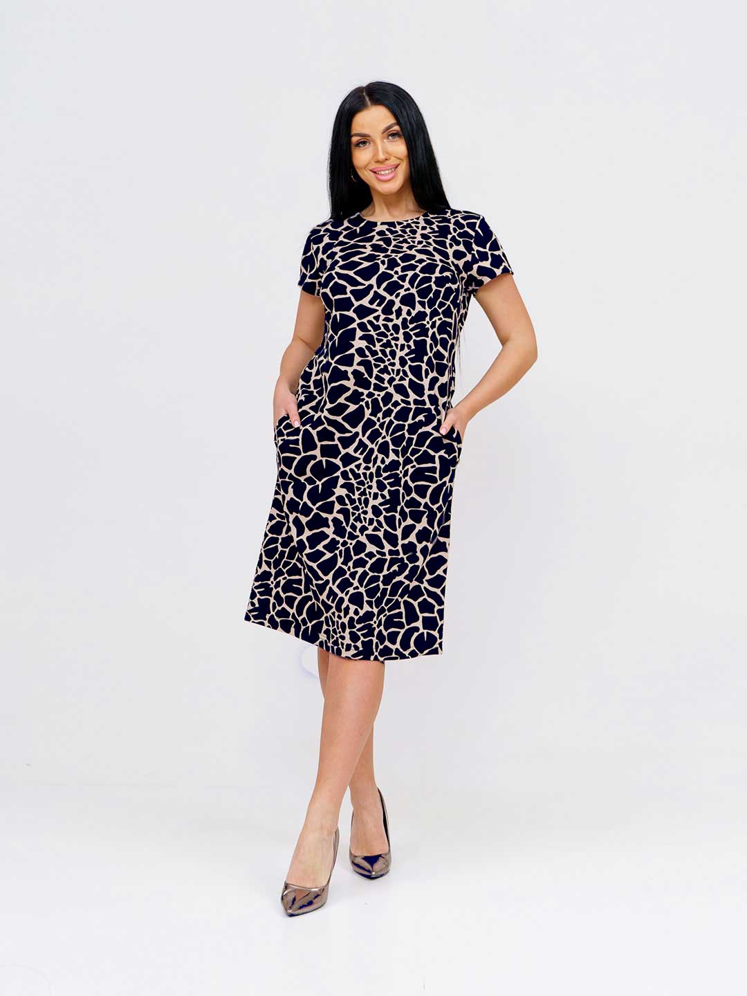 Женское летнее платье из 100% хлопка, полуприлегающего силуэта, длиной ниже уровня колена, рукав втачной, короткий, горловина О-образная, в боковых швах карманы. Платье идеально подойдет для жаркого летнего дня.