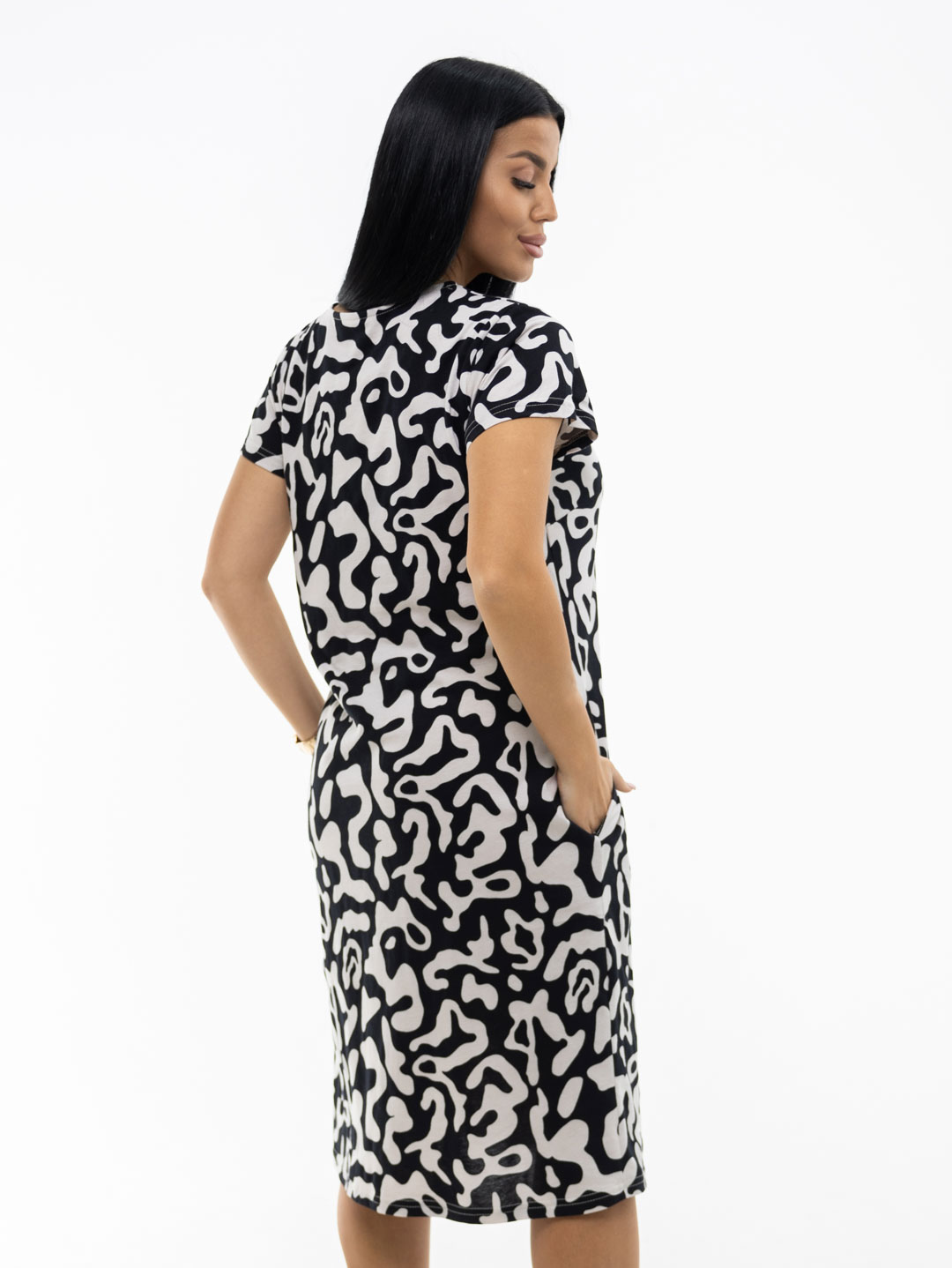 Женское летнее платье из 100% хлопка, полуприлегающего силуэта, длиной ниже уровня колена, рукав втачной, короткий, горловина О-образная, в боковых швах карманы. Платье идеально подойдет для жаркого летнего дня.