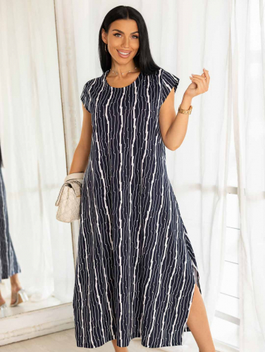 Платье в стиле бохо с карманами, с высокими разрезами по бокам, О-образной горловиной, фигурным рукавом, длины миди. Платье отлично подойдет для отпуска на море.