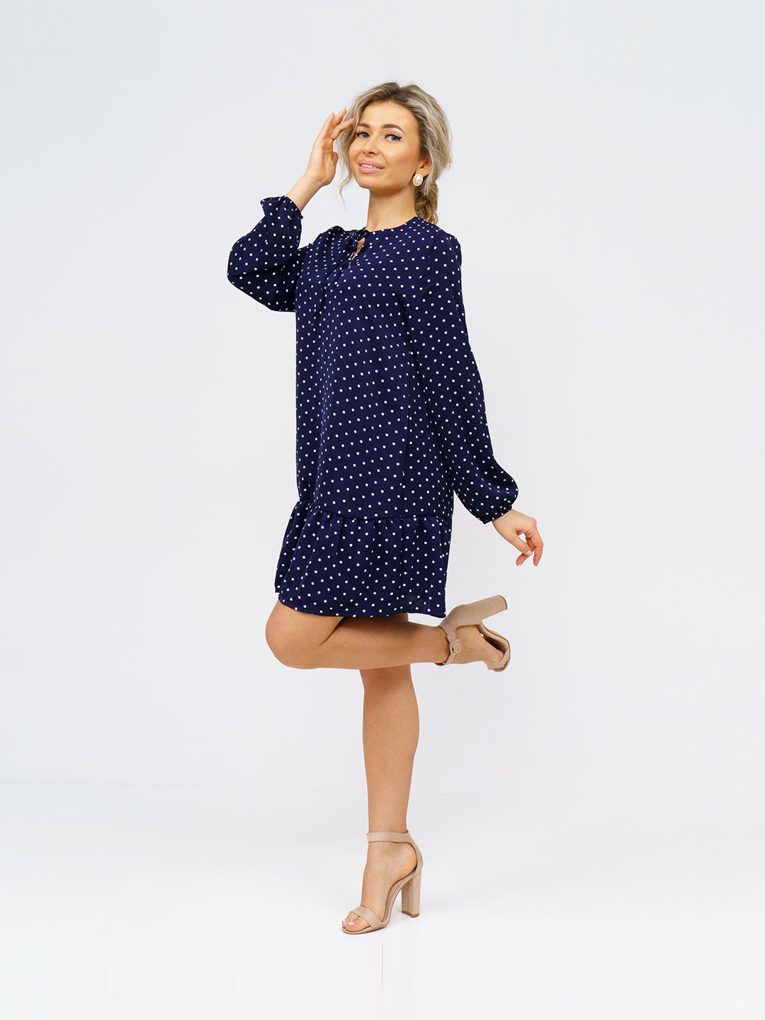 Женское платье из легкой ткани, свободного силуэта с воланом по низу изделия, длинным рукавом, округлой горловиной с завязками. Наше платье отлично будет смотреться как с кедами и сумкой кросс-боди, так и с туфлями на каблуке и широким ремнем.