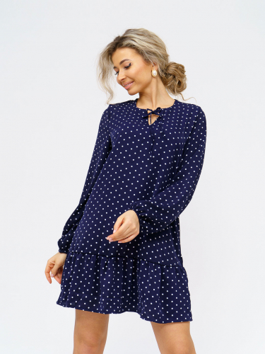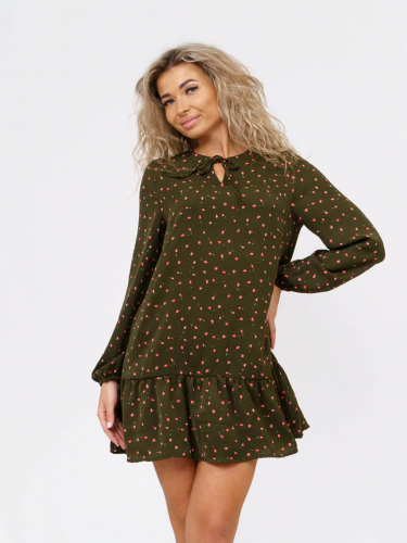 Женское платье из легкой ткани, свободного силуэта с воланом по низу изделия, длинным рукавом, округлой горловиной с завязками. Наше платье отлично будет смотреться как с кедами и сумкой кросс-боди, так и с туфлями на каблуке и широким ремнем.