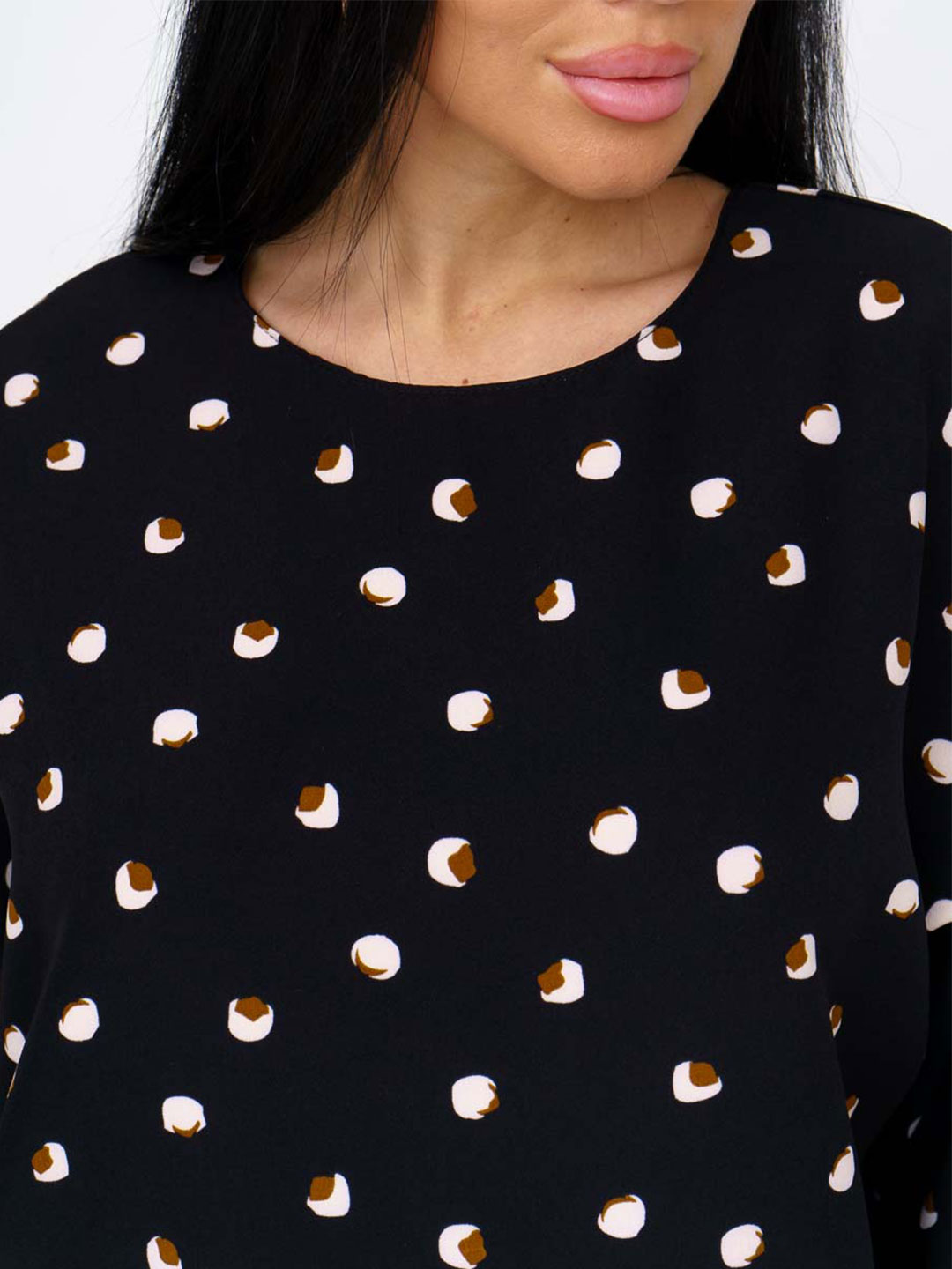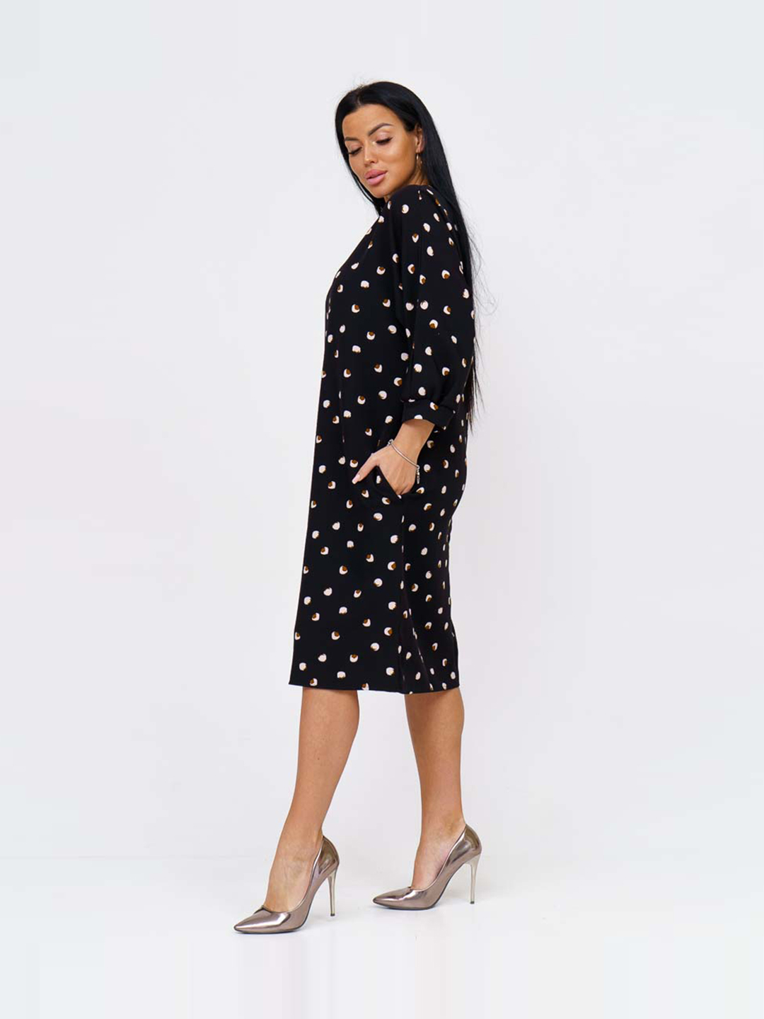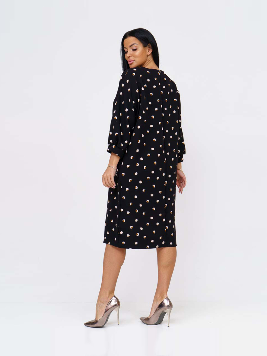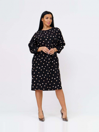Платье женское полуприлегающего силуэта из трикотажного полотна «Барби» длинной до уровня колена. Рукав базового покроя длинной три четверти. Вырез горловины О-образный.