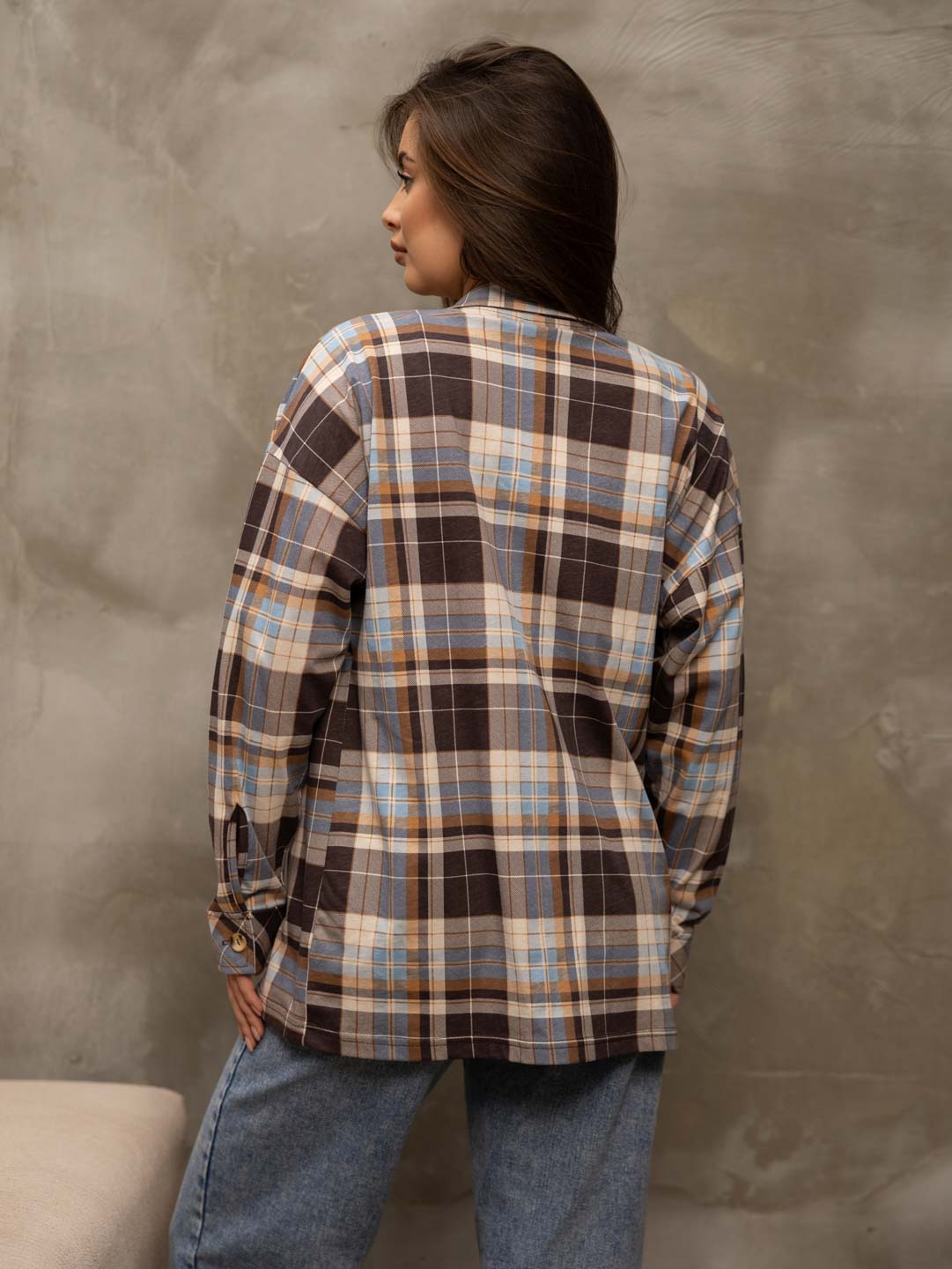 Женская рубашка из трикотажного хлопкового полотна в клетку, свободного кроя, с отложным воротником, втачным рукавом и манжетой на пуговице, на полочке накладной карман. Трендовая рубашка дополнена декоративными пуговицами.