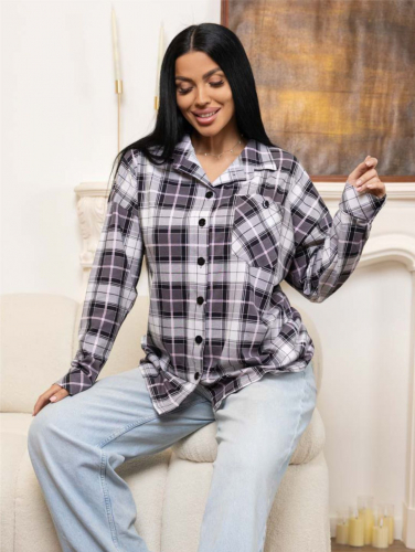Женская рубашка из трикотажного хлопкового полотна в клетку, свободного кроя, с отложным воротником, втачным рукавом и манжетой на пуговице, на полочке накладной карман. Трендовая рубашка дополнена декоративными пуговицами.